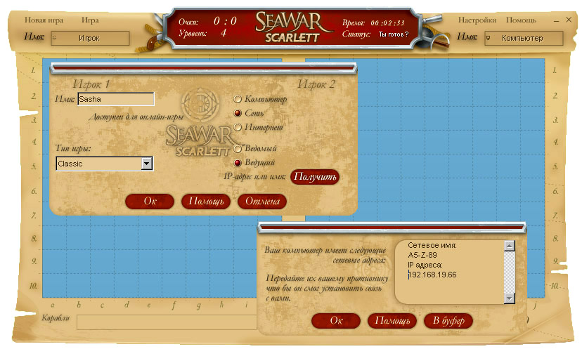 1. Для игры по локальной сети "Ведущему" достаточно знать свое сетевое имя. Соответственно, "Ведомому" для того, чтобы начать игру необходимо ввести IP-адрес или имя "Ведущего".Узнать свое сетевое имя и IP-адрес можно, нажав кнопку "Получить". Не забудьте сообщить его "Ведомому".