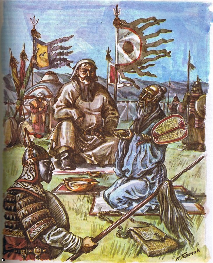 | Темучин, он же Чингис-хан, рис. М. Горелик | Чингис-хан в своей ставке беседует с даосским мудрецом Чан-Чунем. рис. М. Горелик | Монгольский лагерь |