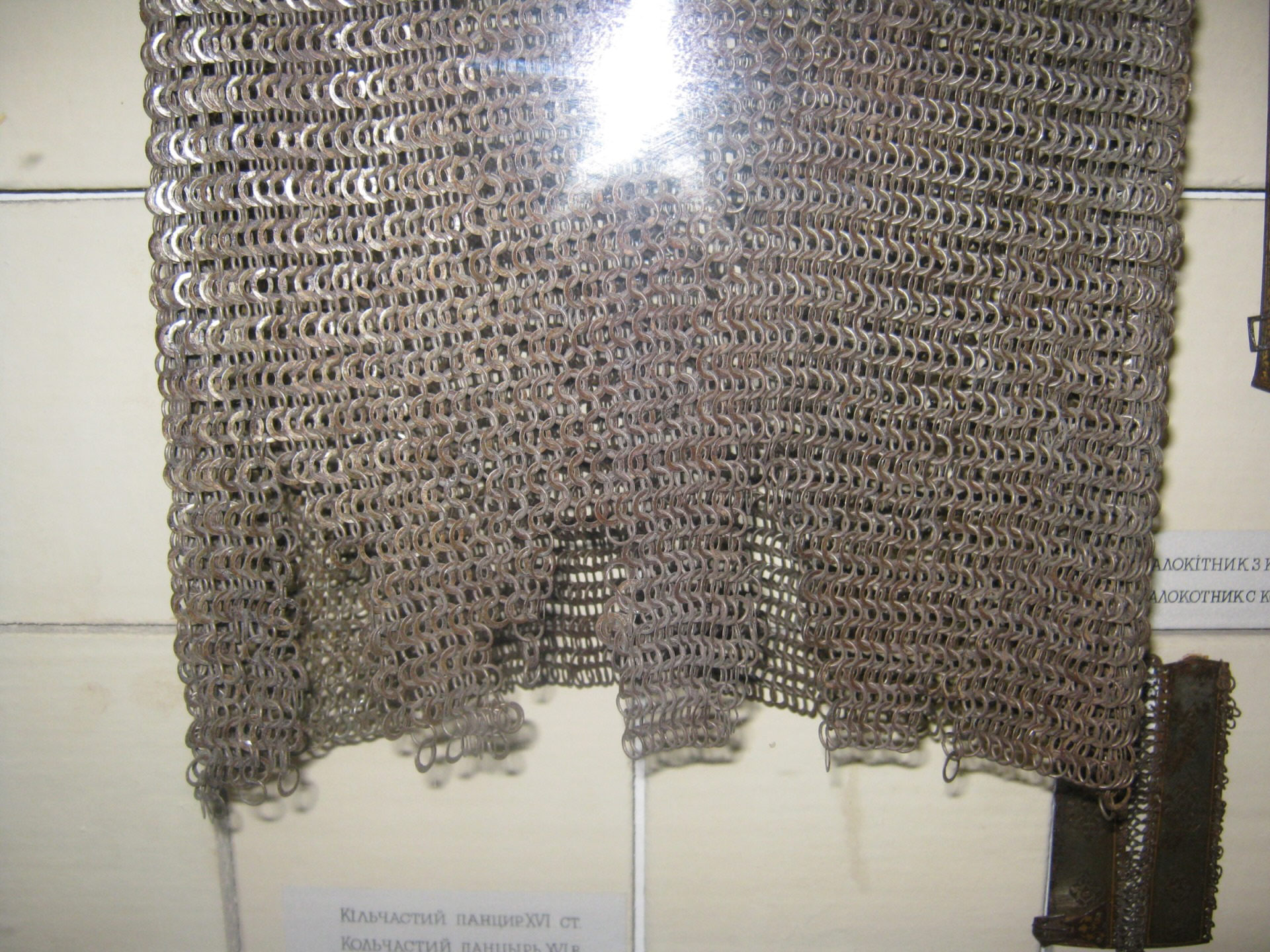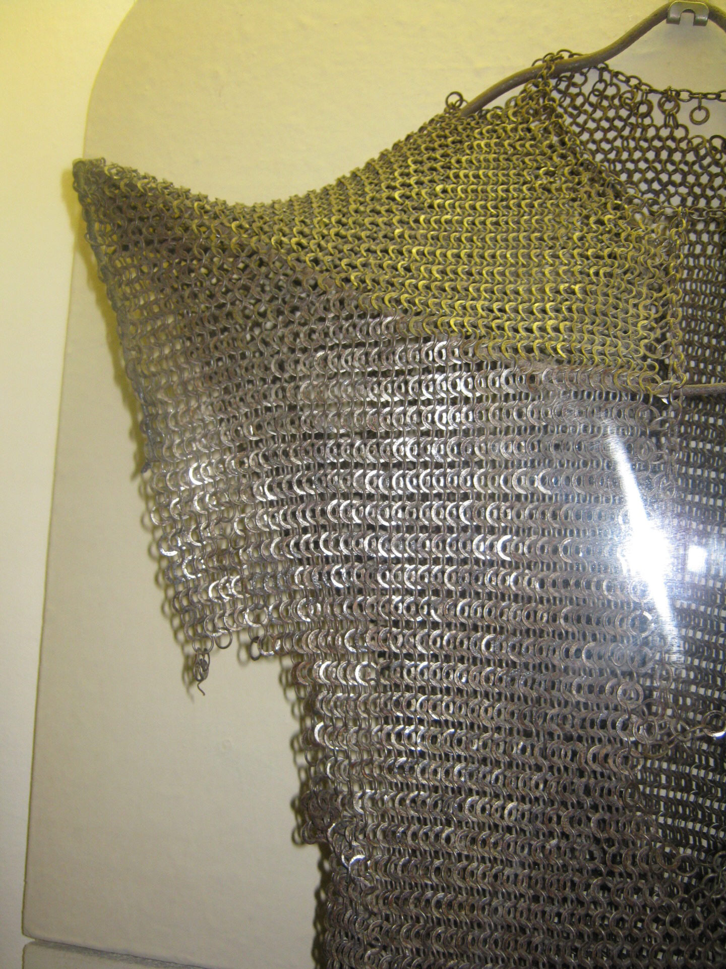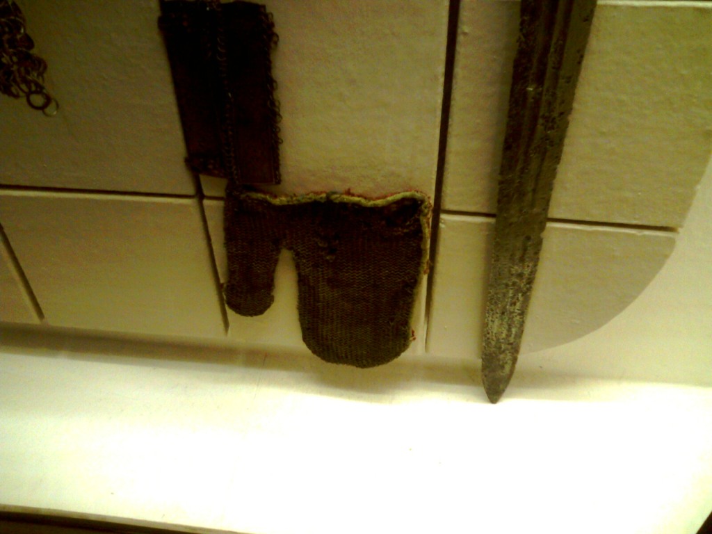 Кольчуга: сплетена из мелких колец толшиной около 1 мм, внутренний диаметр 7 мм. Чередуются плоские плющенны цельные кольца и округлого сечения сведенные в стык. То есть кольца не зафиксированы шипами или гвоздиками, также визуально никаких пайки пайки колец мной не обнаружено. А в целом, кольчуга производит хорошее впечатление от работы мастера кольца подогнана аккуратно без без брака. Кольчуга короткая с очень коротким рукавами, рассчитана на худого человека не широкого в плечах, наверняка очень легкая. В центре груди имеет разрез, с левой стороны груди: не скозное отверстие-разрыв очевидно от холодного оружия, у нижнего края три разрыва от холодного оружия (которые я было принял за фестончатый край).