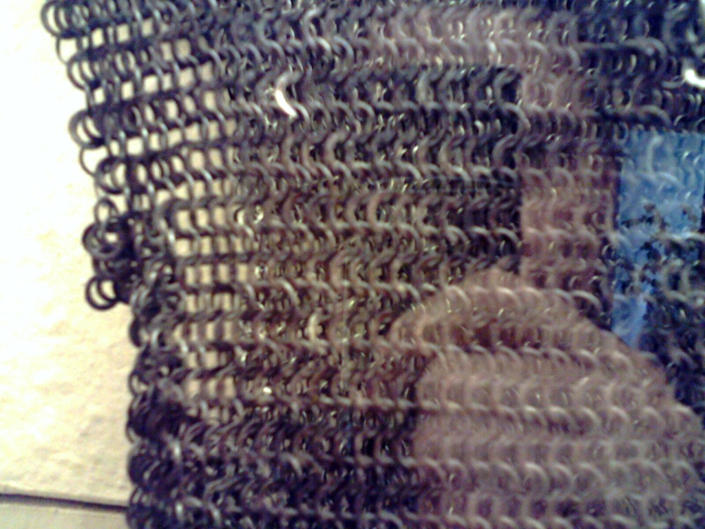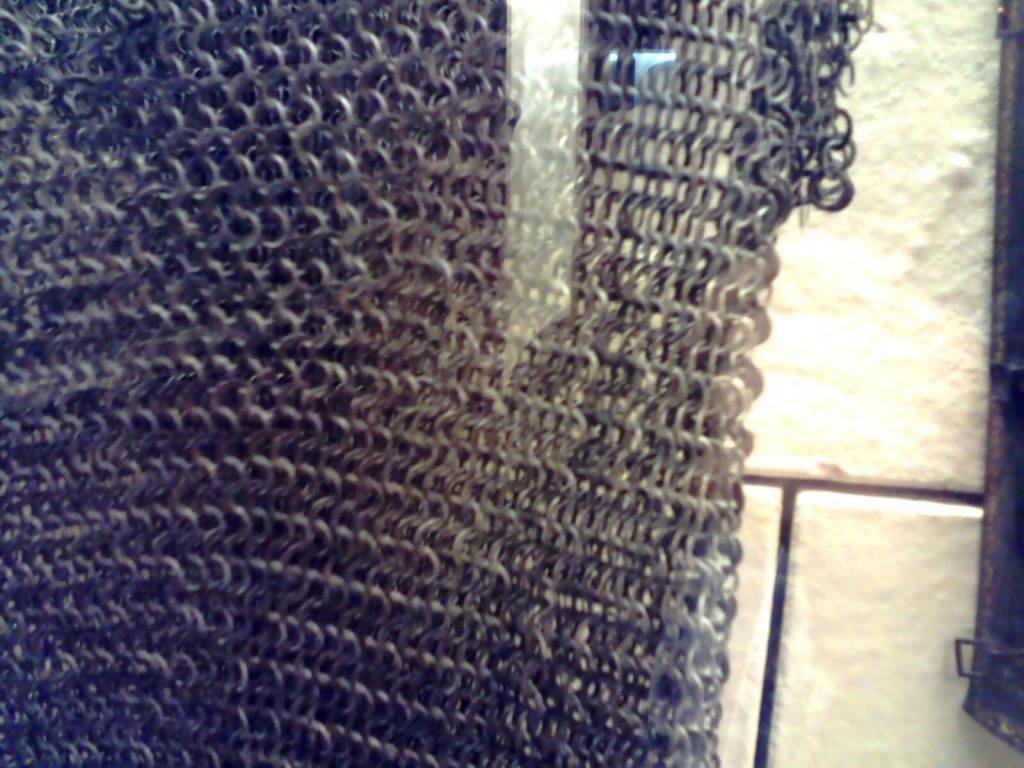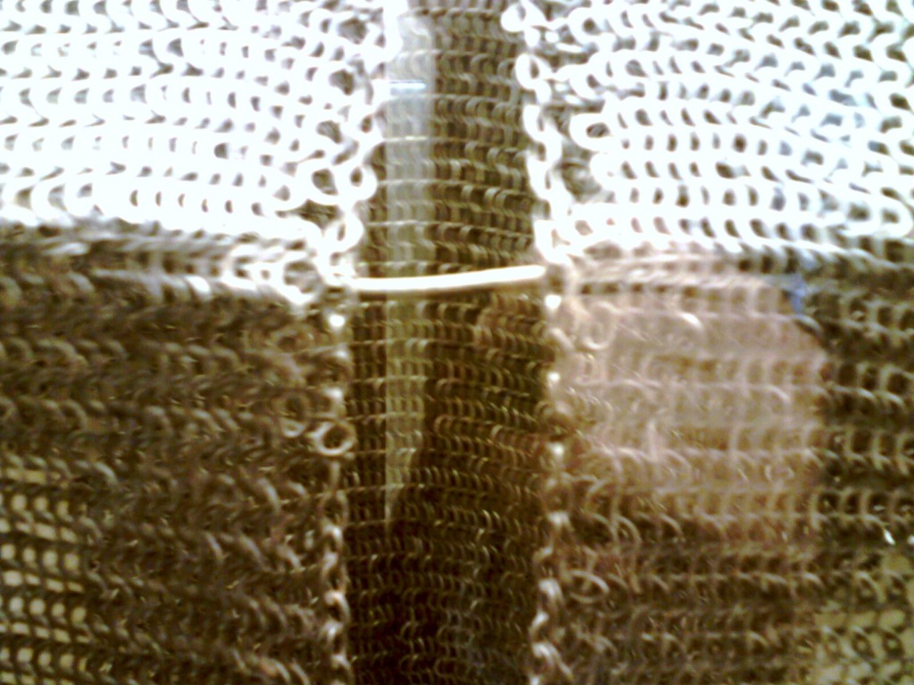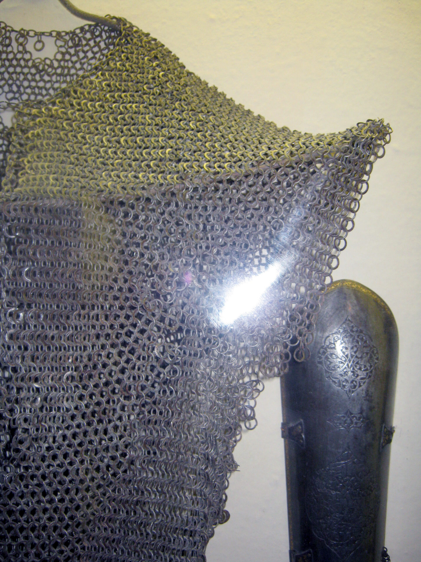 Кольчуга: сплетена из мелких колец толшиной около 1 мм, внутренний диаметр 7 мм. Чередуются плоские плющенны цельные кольца и округлого сечения сведенные в стык. То есть кольца не зафиксированы шипами или гвоздиками, также визуально никаких пайки пайки колец мной не обнаружено. А в целом, кольчуга производит хорошее впечатление от работы мастера кольца подогнана аккуратно без без брака. Кольчуга короткая с очень коротким рукавами, рассчитана на худого человека не широкого в плечах, наверняка очень легкая. В центре груди имеет разрез, с левой стороны груди: не скозное отверстие-разрыв очевидно от холодного оружия, у нижнего края три разрыва от холодного оружия (которые я было принял за фестончатый край).