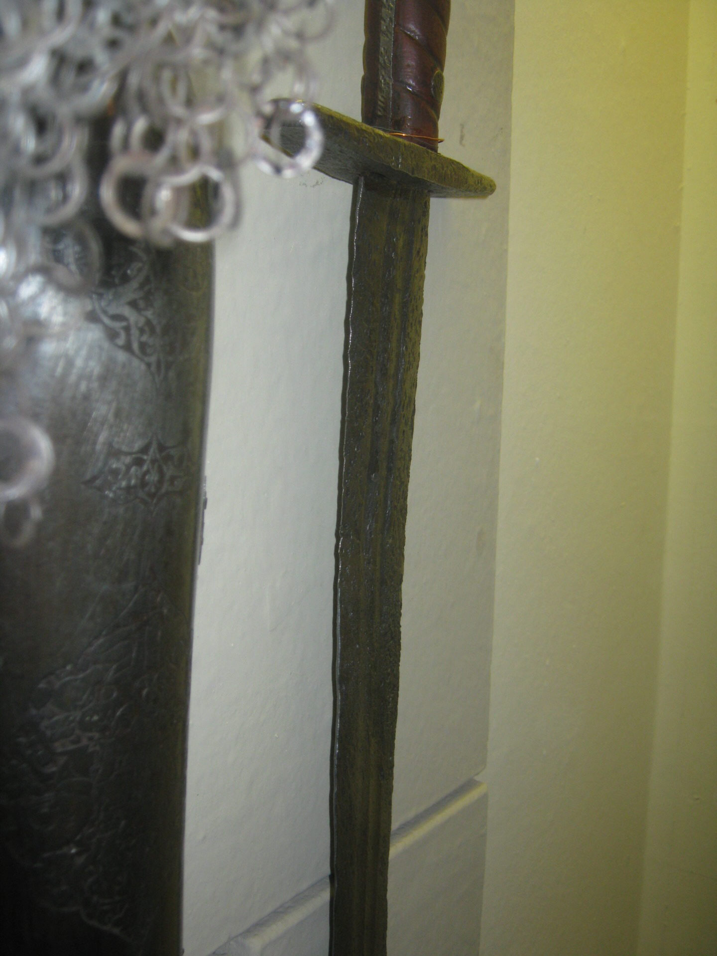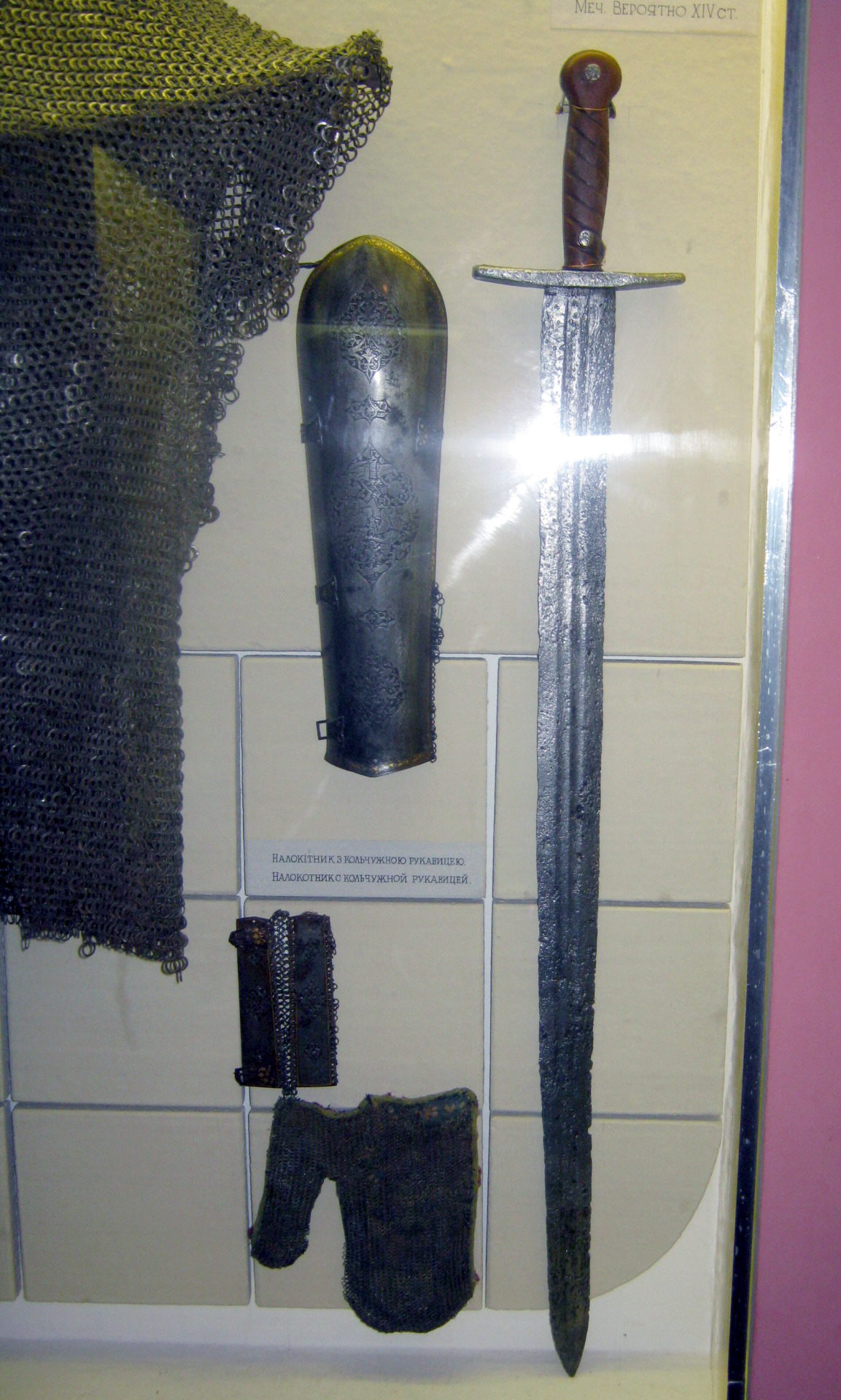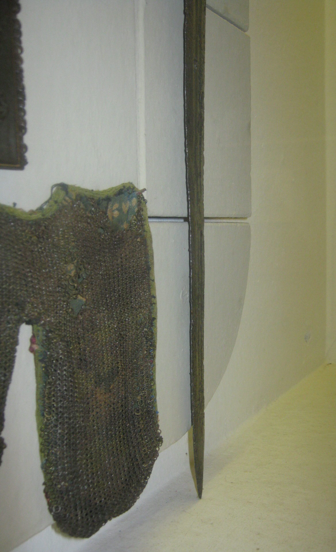 Меч: не длинный (около 90 см) с очень простой крестовиной, клинком кромки первой трети которого идут почти параллельно, а две трети плавно сужаются к отрию. Практически через весь клинок идут два дола, слегка искривленные в твух местах, да и в целом клинок правильностью похвастаться не может. На всем клинке видно большое количество мелких расчищенных каверн от ржавчины. Надо упомянуть что клинок очень тонкий, его толщина даже у пятки около трех миллиметров. По словам сотрудников музея он весит менее килограмма.