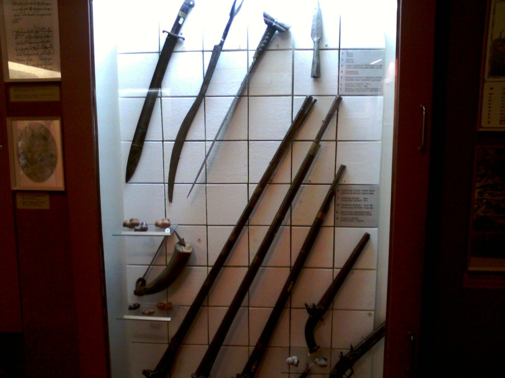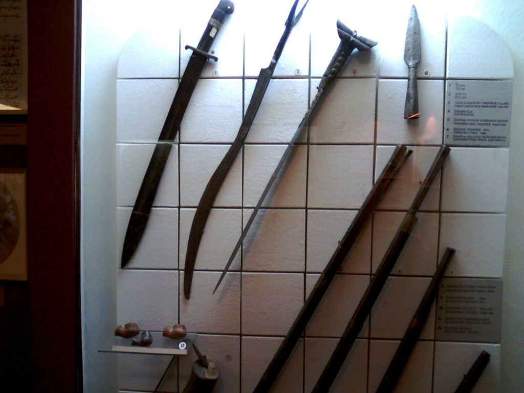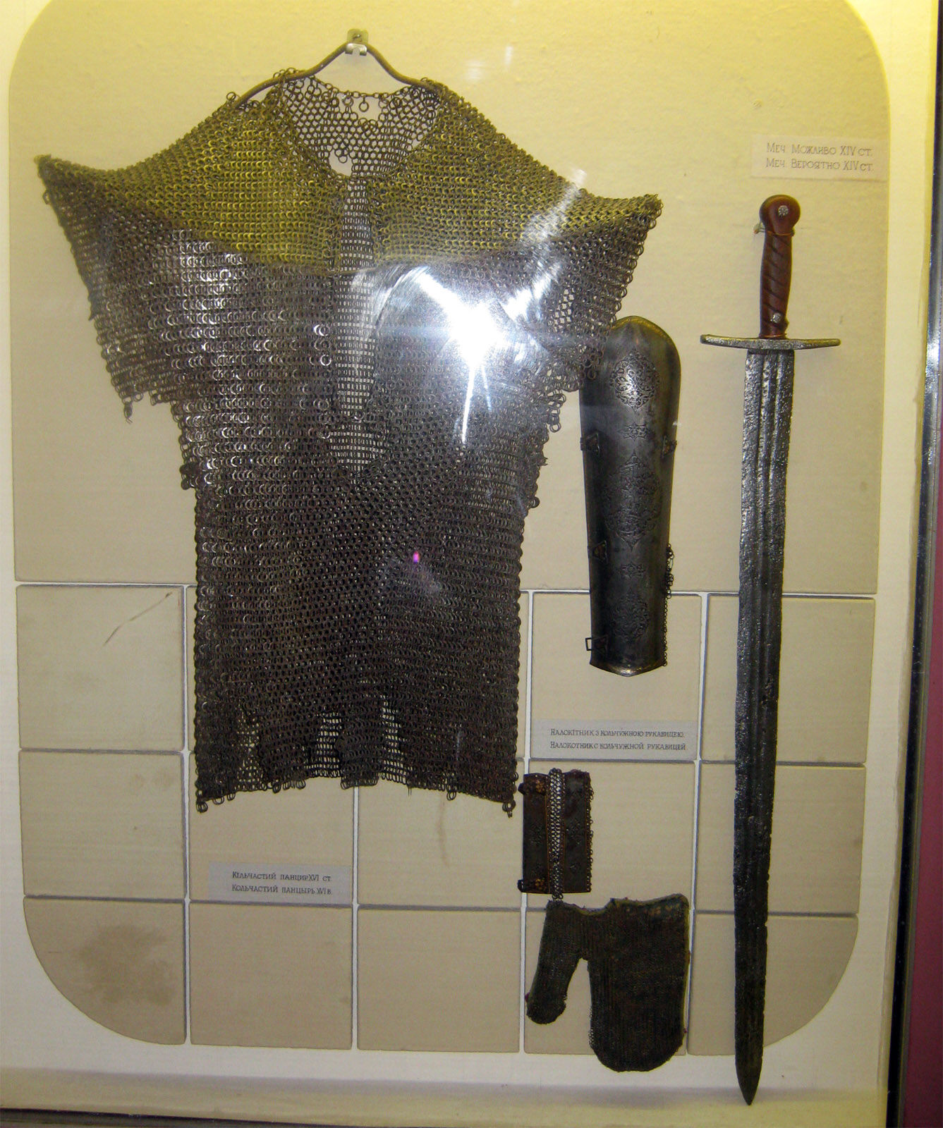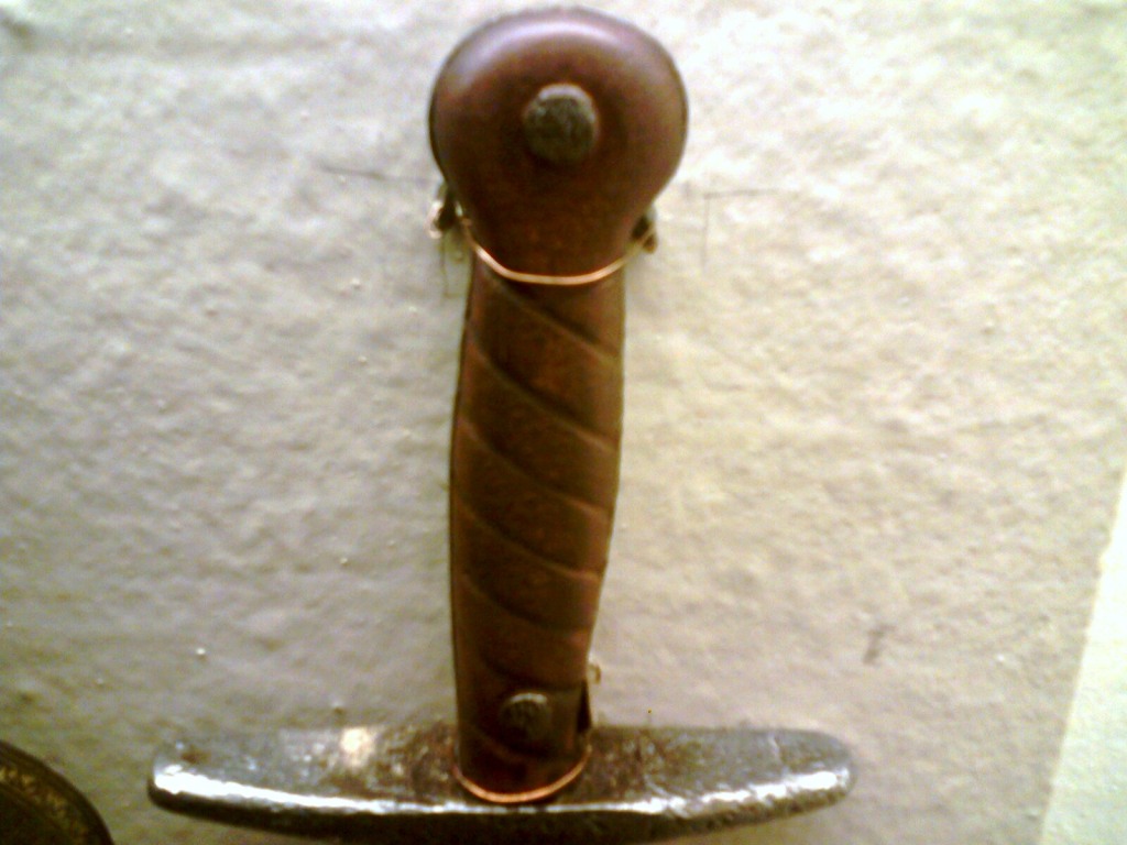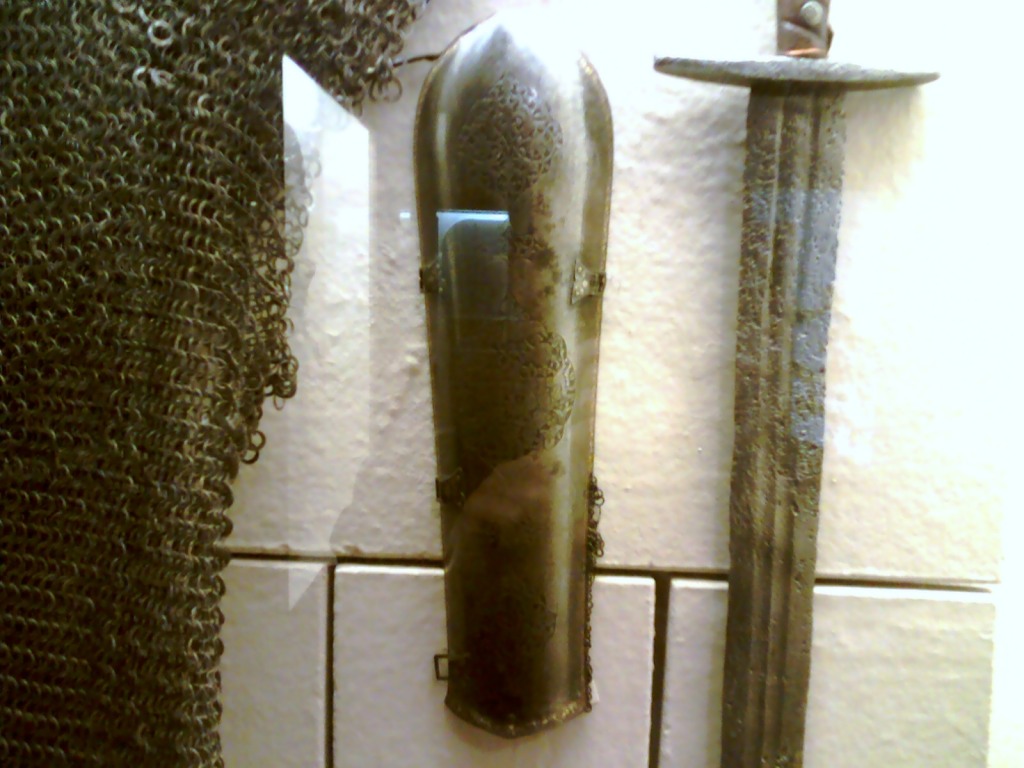 Меч: не длинный (около 90 см) с очень простой крестовиной, клинком кромки первой трети которого идут почти параллельно, а две трети плавно сужаются к отрию. Практически через весь клинок идут два дола, слегка искривленные в твух местах, да и в целом клинок правильностью похвастаться не может. На всем клинке видно большое количество мелких расчищенных каверн от ржавчины. Надо упомянуть что клинок очень тонкий, его толщина даже у пятки около трех миллиметров. По словам сотрудников музея он весит менее килограмма.