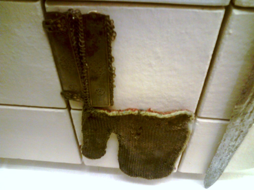 Крестовина клинка цельная покрыта мелкими кавернами, черенок рукояти плоский сама рукоять очевидно и в давние времена состояла из двух половин что для мечей 14 века крайне не типично – наверняка мы имеем дело с мечом куда более поздним чем 14 век. Хотя тут легко ошибиться клинок и крестовина намекают на Тип XIII по типологии Э. Окшотта. Поэтому, вероятно, что меч, кольчуга и потерянный шлем были комплексом.