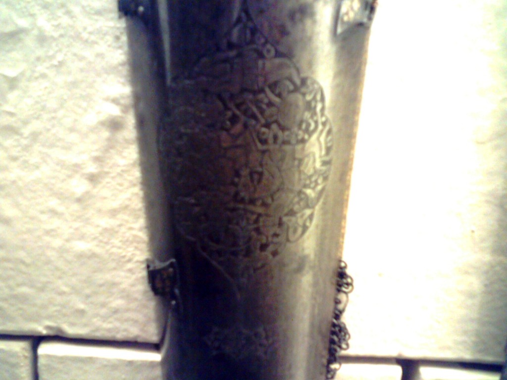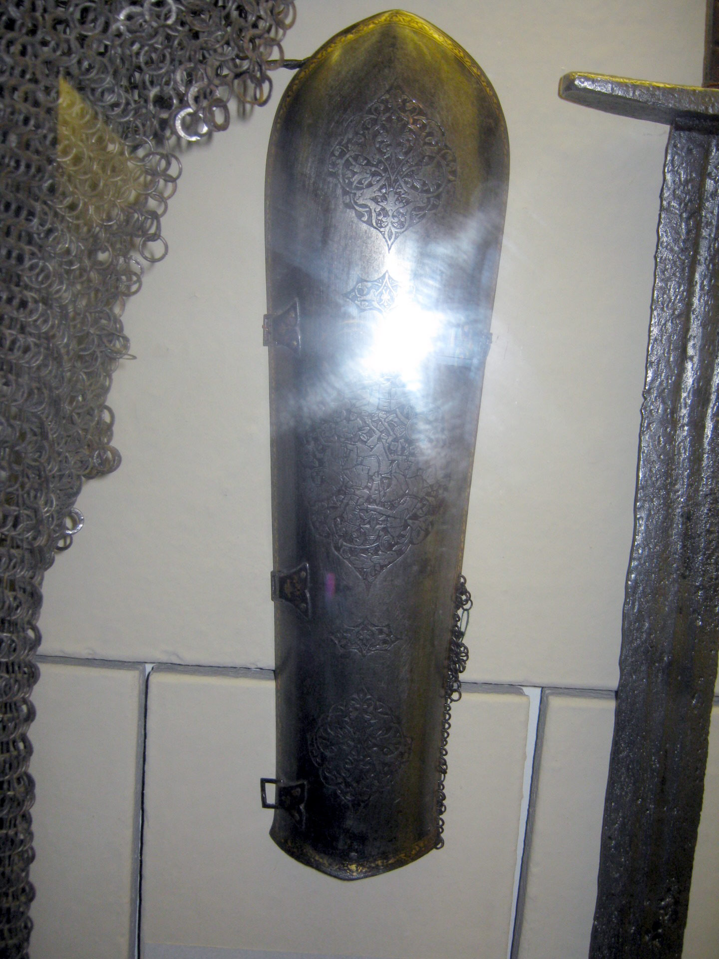 Наруч тубчатый не глубокий, персидского типа, механически поврежден – рукавица и вам наруч разъединены, вероятно один сегмент внутренней створки наручей утерян. Повреждений коррозией почти нет, по краям наруча и на обоймах ременных пряжек видна инкрустация желтым металлом. На лицевой стороне выгравирован орнамент. Для соединения с внутренними створками использовалась кольчуга из сведенных колец округлого сечения, рукавица из мелких сведенных колец, сохранилась даже подкладка под рукавицу. Желтоватый налет заметный на фотографии в реале почти не виден, возможно остаток омеднения для имитации лапы тигра или просто налипание консервирующго вещества. Подобные наручи датируются 17-18 веками.