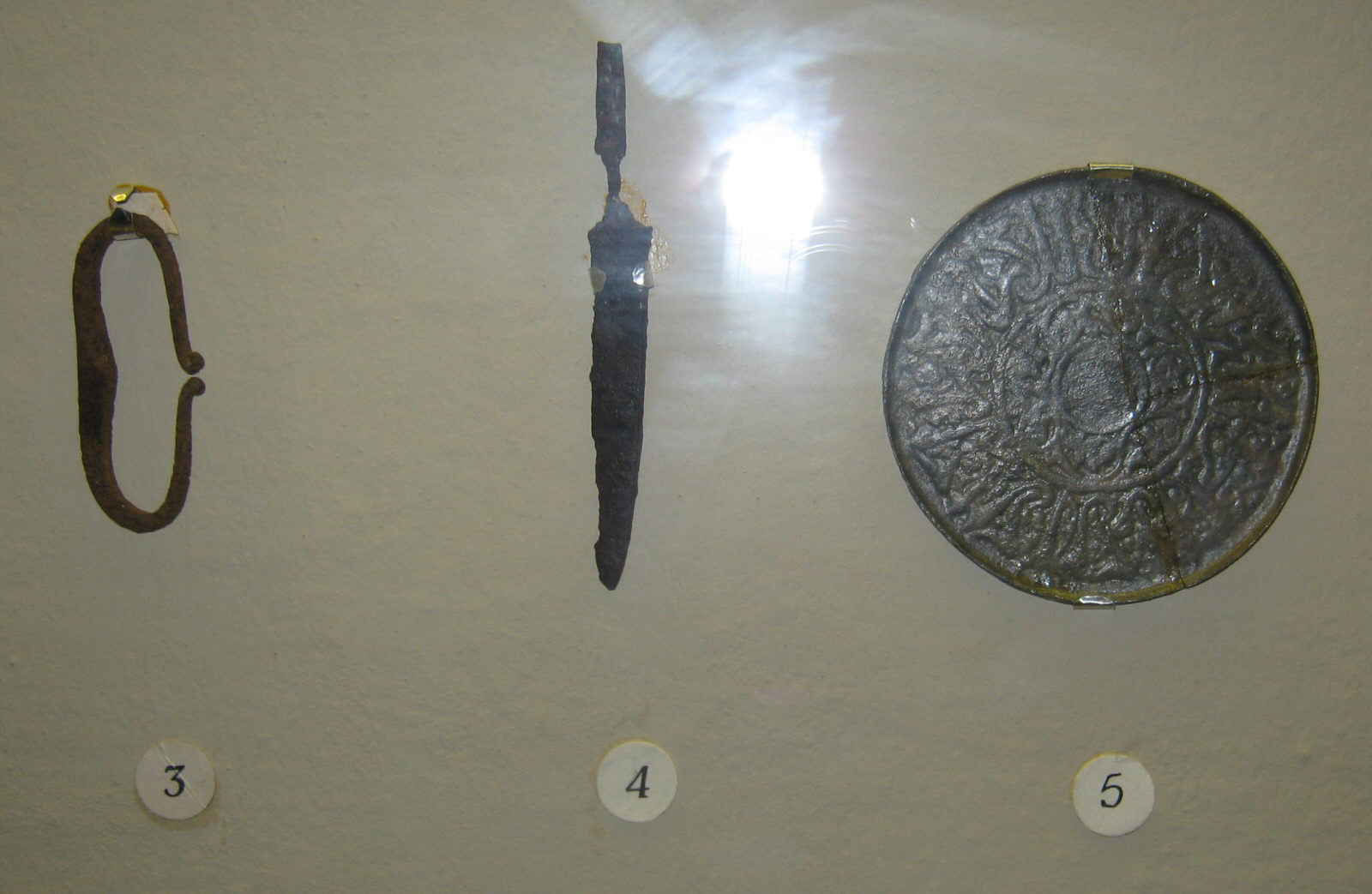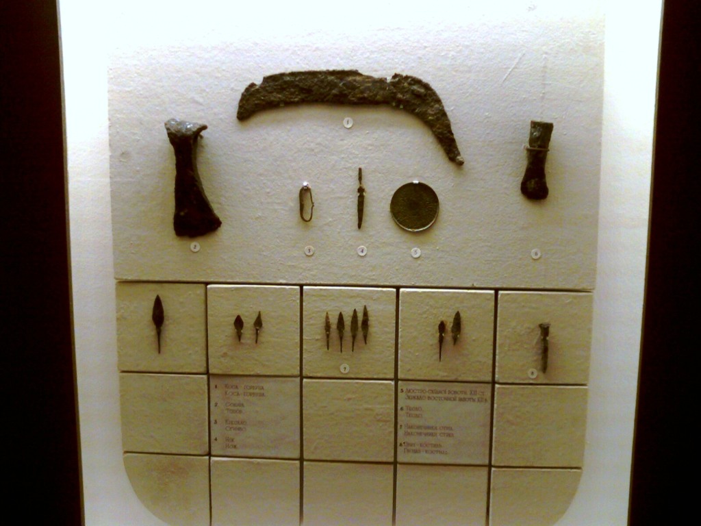 Немного подробностей: меч и кольчуга а также: топор, коса, тесло, кресало, ножичек, зеркало, 9 наконечников стрел, гвоздь были обнаружены в начале 50-х годов во время раскопок на месте строящегося водохранилища, вода которого должна была затопить места связанные с Таваньской переправой. В ходе раскопок было обнаружено значительно большее число предметов они пополнили коллекции нескольких музеев УСССР.
