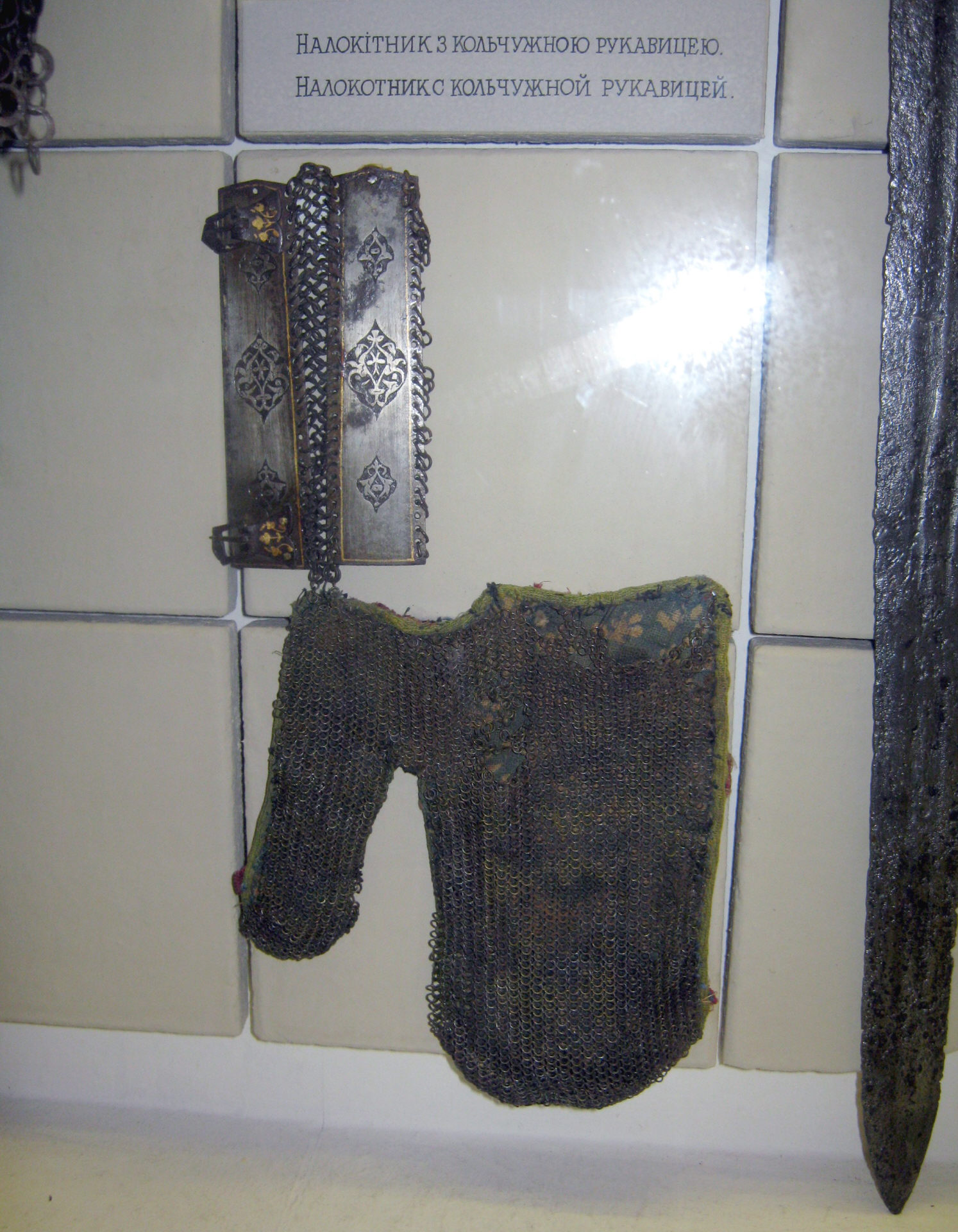 Меч, кольчуга и разрушенный коррозией шлем были обнаружены неподалеку от пгт. Малая Каховка на берегу нынезатопленной водами водохранилища реки Козак. Расчистка и консервация кольчуги и меча проводилась специалистами Херсонского краеведческого музея и данные экспонаты были переданы в Каховский городской музей. О шлеме никаких данных нет. Из Бахчисарая была передана коллекция мушкетов, пистолей и кинжалов включавшая в себя и наруч персидского типа. Кольчуга и меч не публиковались в журнале Советская Археология. На табличках музея указано что кольчуга 16 ст. а меч 14 ст.