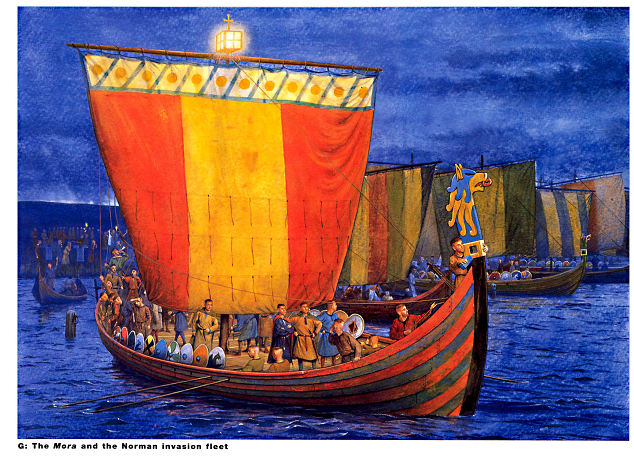 На следующий день войска Вильгельма сели на суда. Флот нормандцев состоял из большого количества мелких судов, загруженных лошадь ми, что значительно стесняло действия воинов при обороне судна. Король Гарольд хотел воспользоваться этим и атаковать нормандцев в море. Это ему не удалось из-за того, что в это время в северной части Англии высадились норвежские викинги, которых привел брат Гарольда, изгнанный им из отечества.