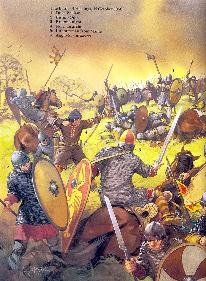 Тогда Гарольд решил сначала разбить этих врагов и двинул свое войско на север. Этот план он блестяще реализовал — 25 сентября он одержал победу над викингами; уже три дня спустя на берегу Англии высадился Вильгельм со своими лучниками и конным отрядом рыцарей. Вместе с войсками находились плотники, кузнецы и чернорабочие, которые принялись выгружать три деревянных замка и крепостца, срубленные в Нормандии.