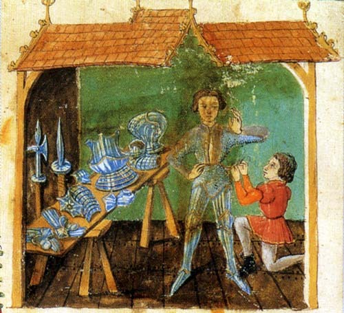 "Облачаться в появившуюся в 13 и ставшей очень популярной в 14 веке пластинчатую броню рыцарю приходилось с помощью оруженосца."