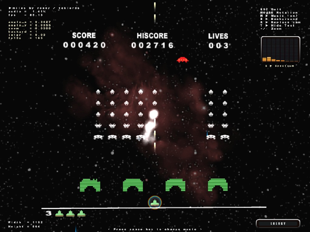 Представляю вам классическую Аркадную игру Spice Invaders. Первая версия игры вышла в 1977 году. Тогда было всего лишь шесть цветов. Но сейчас это уже совсем другая игра. Сейчас она трехмерная и полноцветная снабженная спецефектами. Итак в бой, не пропустите корабли злобных инопланетян к себе расстреливайте их из всего чего только можно. Ловите апгрейды и изменяйте интерфейс игры и свойства своего космического корабля. Несмотря на насыщенный игровой процесс игра очень компактна.