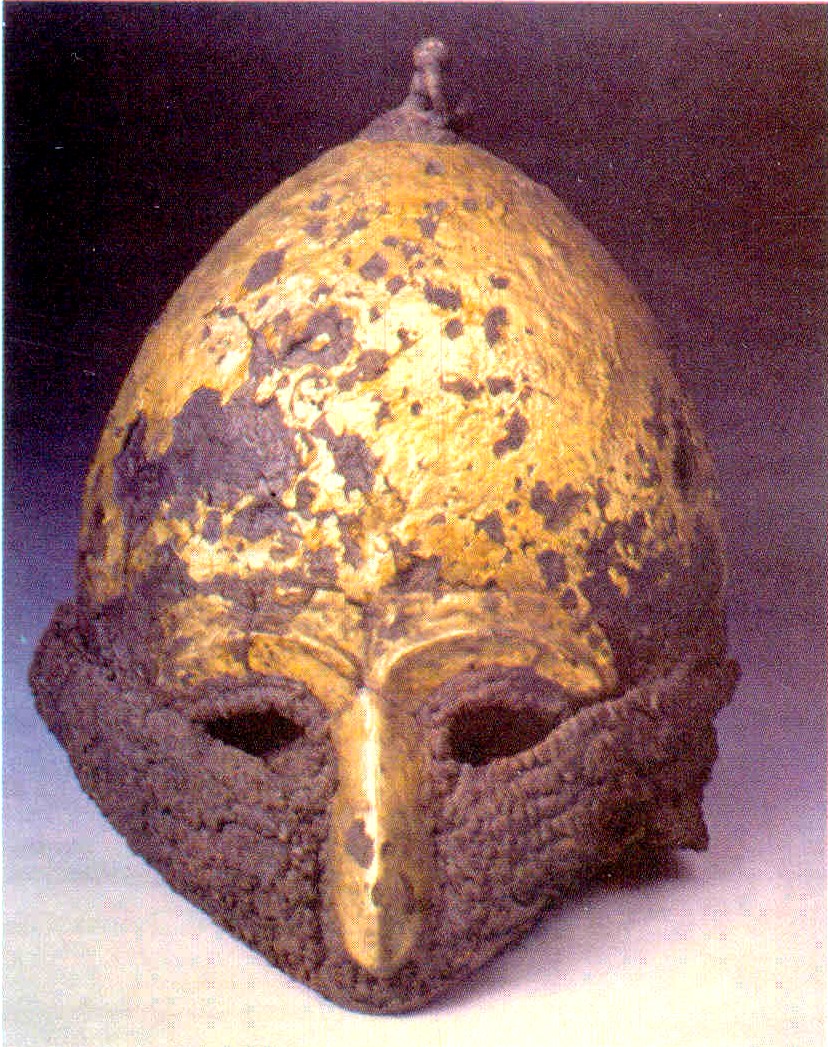 Костяные рукояти ножей, инкрустированные серебром с позолотой Шлем из Чингульского кургана, позолоченный с железной полумаской.