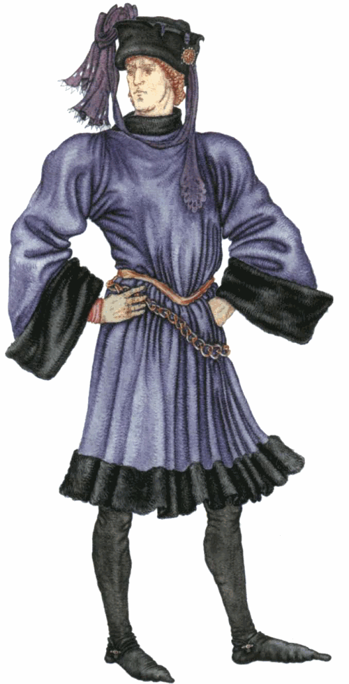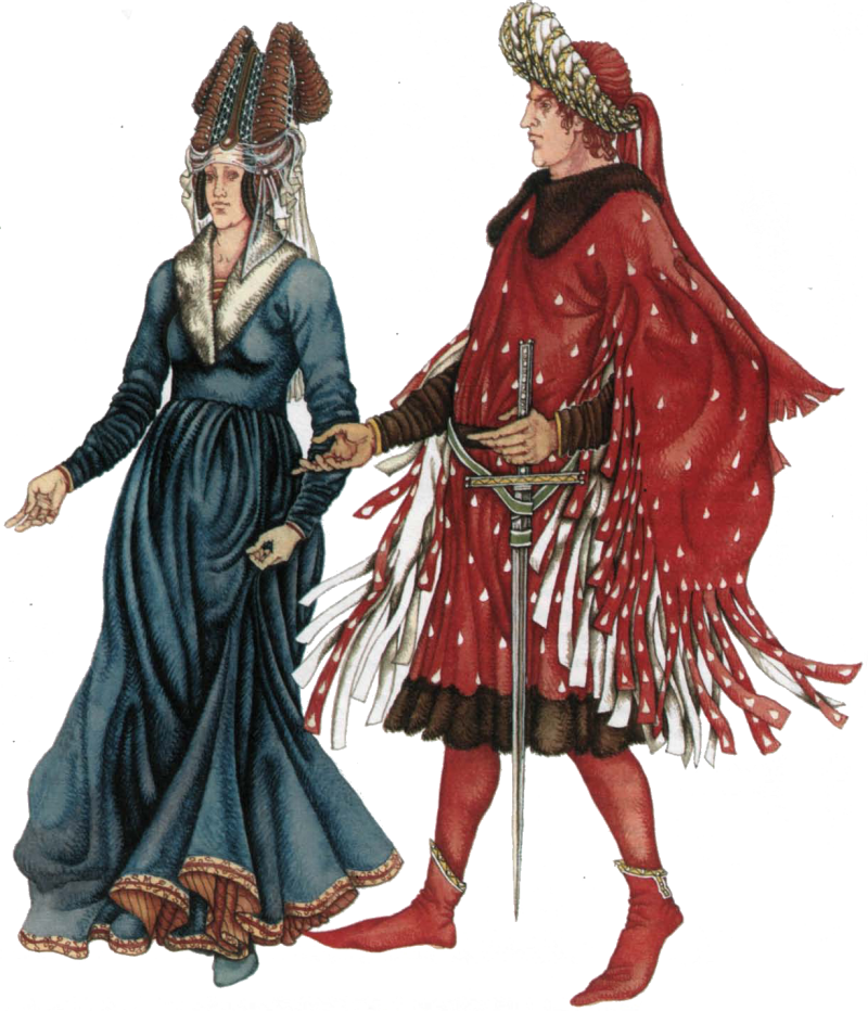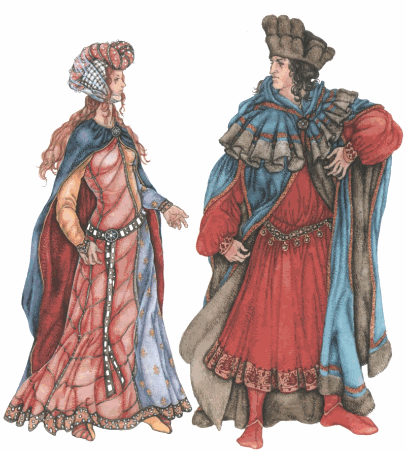 Простой по крою одеждой был нараменник («рамена» — плечи) — род плаща, состоявшего из куска ткани, согнутого пополам и с вырезом для головы. По бокам нараменники знати имели меховую оторочку и обычно подпоясывались. Другой разновидностью этой одежды был сюрко, сшивавшийся по бокам и имевший короткие рукава, но чаще всего — обычные проймы. Любопытно, что только с XIII в. рукава стали пришивать к одежде раз и навсегда: до этого на ночь их отпарывали, ибо одежда была настолько тесна, что ее невозможно было снять. К середине XIV в. додумались сшивать и половинки штанов. Для женского платья обычным стал шлейф, длина которого зависела от положения женщины в обществе. Например, королева могла иметь шлейф в 11 локтей (один локоть — 45 см), герцогини и принцессы — в 8 локтей. В обиход вошли перчатки. Если в XI в. их выделывали только из кожи, то затем стали шить из дорогих тканей и украшать драгоценными камнями и вышивкой. В церковь в перчатках не входили. Руку в перчатке для рукопожатия не подавали — такой жест считался оскорбительным. Вручение своей перчатки другому лицу означало оммаж — признание перед ним своей феодальной зависимости, а брошенная в лицо или под ноги перчатка означала вызов на поединок. Временем «бургундских мод» назвали XV столетие. Представители знати подражали тому, как одевались при дворе герцога Бургундского. Как отмечал австрийский хроникер того времени, каждый тогда носил то, что ему нравилось. У одного щеголя жакет был из двух цветов, а у другого — левый рукав был намного шире правого. У некоторых рукава украшали полосами ткани различных цветов и даже золотыми монетами. А вот сеньор Ла-Гир и вовсе явился во дворец в роскошном красном плаще, который был сплошь увешан крошечными серебряными колокольчиками.