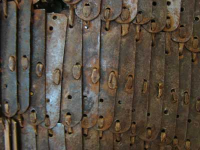 Это уздечка украшена серией точеной и тисненой железной арматуры покрытой золотом. Чтобы придать орнаменту большую глубину часть его нанесена на железную основу.