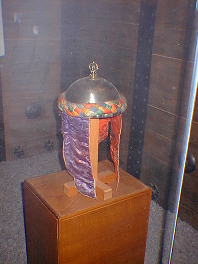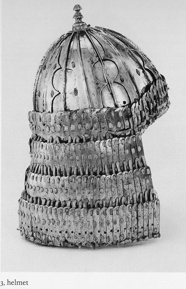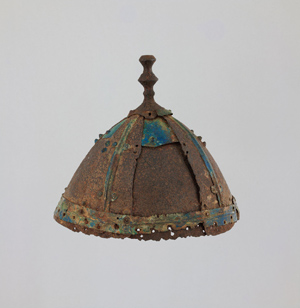 Спирали орнамента этого шлема появляются  также на других объектах в выставке, некоторые из которых были отнесены к Китаю и Тибету: два меча (кат. nos. 55, 56), Седло (кат. № 111.), Стремена (кат. 129), группа упряжь арматура (кат. №. 133), и две уздечки (кат. nn. 134, 135). Пропорции шлема достаточно малы, поэтому есть предположение что он был сделан для ребенка или очень маленького человека.