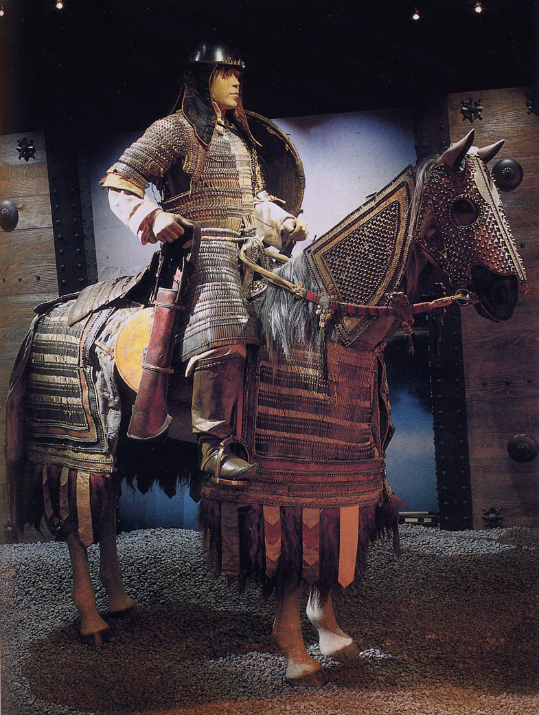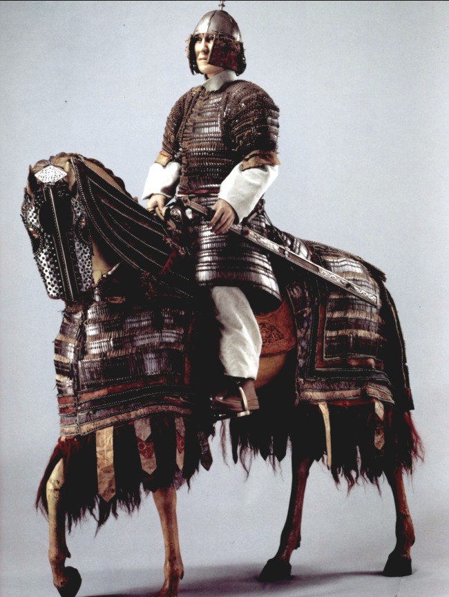 Эти элементы отличаются хорошим состоянием и высоким качеством, на что указывают тщательно собранные пластины и прекрасное украшение нижней границы позолоченной и лакированной кожи. Доспех состоитт из peytral (грудь), правой и левой панелей, накрупника для защиты задней части лошади, и концовки для защиты области вокруг и под хвостом. Ряды пластинок и границы украшены кожей и опираются на слой из войлока, есть челка рыжих волос яка и текстильные шнурки, верхняя окантовка из толстой хлопчатобумажной ткани.