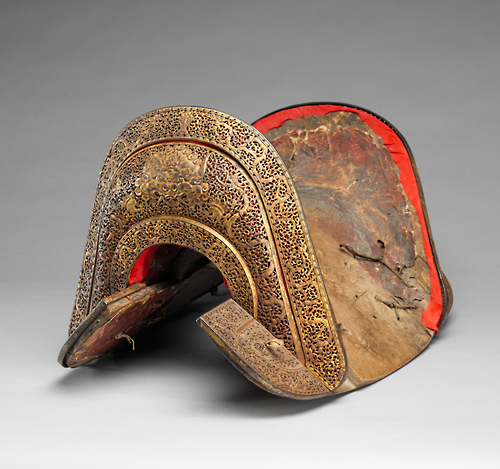 Это седло, однако, использовалось в Тибете, о чем свидетельствует письмо тибетских ка, клеймо на нижней стороне каркас сиденья, как инвентарный номер. Должно быть, принадлежало тибетскому дворянину самого высокого ранга, возможно, получено в подарок непосредственно от императорского двора. Пластины седла  изготавливаются из относительно толстого железа. Глубоко точеные и мотивы плотно расположены так, что пробелы в завитках узкие по сравнению с  другими примерами, представленными здесь. Пластины покрыты толстым слоем золотой фольги. Кораллы и слоновая кость в центре представляют Три Драгоценности: Будду, Дхарму (буддийское учение) и сангха (община верующих).