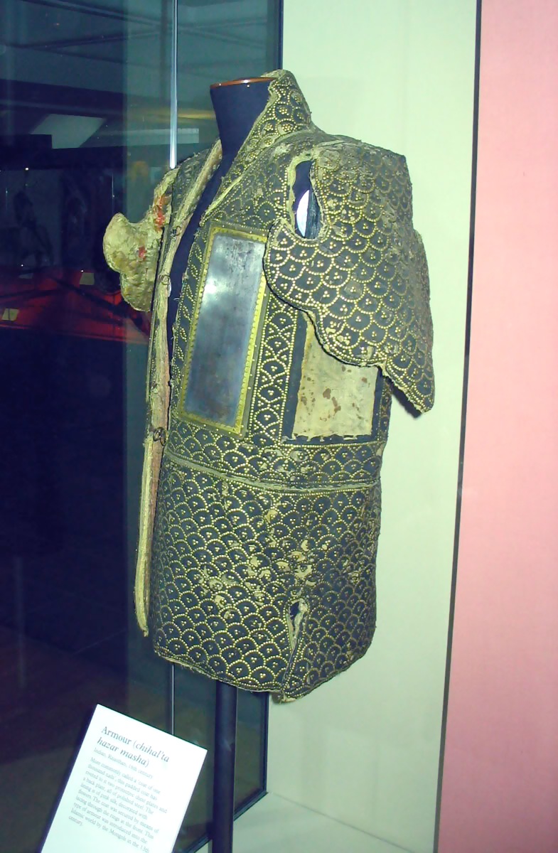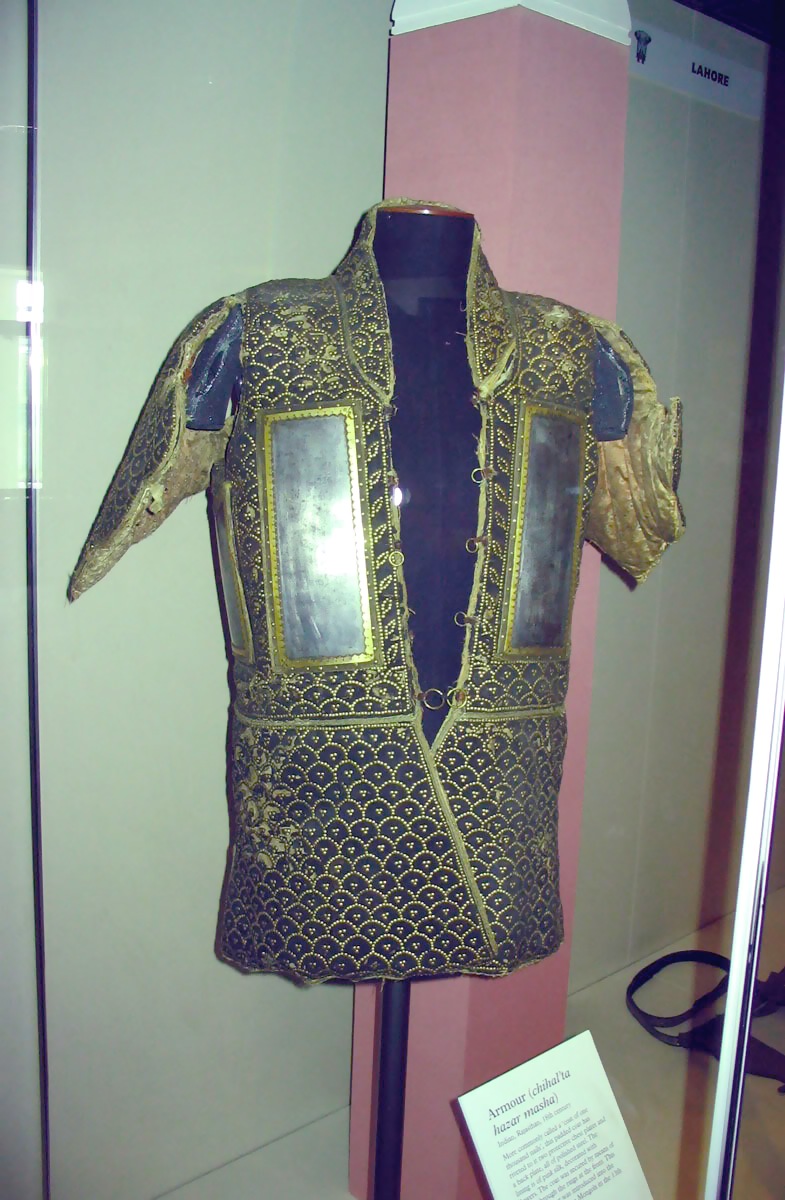 Применение традиционных доспехов из широких кожаных сегментов или мелких чешуек соединенных шнурками между собой, то есть ламинарного и ламеллярного стиля в отличии от зоны Персидского влияния в Индии не зафиксировано, поскольку на момент завоевания Индии Моголами такие доспехи вышли из употребления.