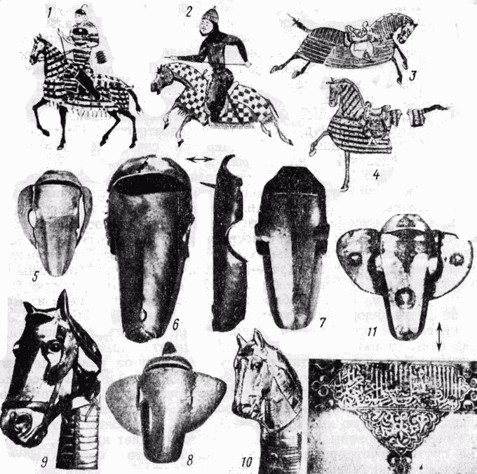 Значительное распространение в монголо-татарской тяжелой коннице получил конский доспех. Разумеется, снарядить своего коня таким очень дорогостоящим вооружением могли лишь весьма состоятельные и знатные лица. Сохранилось подробное описание монголо-татарского конского доспеха, ламеллярного и ламинарного, стального и кожаного, сделанное Плано Карпини в середине XIII в. На иранских миниатюрах XIV в. часты изображения этого доспеха (табл. X, 1-4). В самой Монголии конский доспех применялся еще в XVII в., а тибетские ламеллярные конские панцири, бытовавшие вплоть до начала XX в. и непосредственно продолжавшие раннюю традицию, сохранились до наших дней. Судя по изображениям (табл. X, 1, 2), конские доспехи западных областей бывшей империи чингизидов во второй половине XIV в. состояли из нагрудника, двух боковин, подхвостника, накрупника, двухчастной шейной брони и наголовья. На некоторых панцирях XIV в. (табл. X, 3, 4) нагрудная часть составляет единое целое с боковинами. Конские панцири были ламеллярными – из стальных (табл. X, 3) или раскрашенных и лакированных кожаных (табл. X, 1) пластинок, стегаными (табл. X, 2), а также ламинарными – из полос стали или расписной кожи. В конце XIV в. пластинчато-кольчужное бронирование распространилось и на конский доспех (табл. X, 4), почти вытеснив через столетие все другие виды брони. Монголо-татарский конский доспех являлся неотъемлемой частью устойчивой традиции боевого прикрытия коня, усиленно развивавшейся в Центральной и Восточной Азии еще в I тыс. н. э. Применялся конский доспех в раннем средневековье в Средней Азии и на Ближнем Востоке, в Европе же до середины XIII в. – лишь спорадически и, видимо, под влиянием восточных противников крестоносцев. Недавно А. Н. Кирпичников предпринял попытку доказать существование русского конского доспеха с начала XIII в. Основанием для этого ему послужили конское стальное оголовье из Киевского Исторического музея и летописное сообщение о конском доспехе, применявшемся в войске Даниила Галицкого. Однако в летописи прямо говорится, что защитное вооружение войска Даниила было татарским. Что же касается оголовья из Киевского Исторического музея (табл. X, 5), то оно имеет прямое отношение к нашей теме. Дело в том, что этот предмет практически депаспортизован. По косвенным данным А. Н. Кирпичников и Е. В. Черненко связали его с раскопанной В. В. Хвойкой в 1898 или 1901 гг. кочевнической могилой с конем в с. Ромашки в Поросье97. Интересно, что в начале своей статьи авторы публикации отметили близость рассматриваемого оголовья ближневосточным образцам XV в., но дальнейший ход рассуждения увел их в сторону. На самом же деле нет никаких оснований полагать, что оголовье из Киева относится к другому региону и эпохе, нежели большая группа стальных оголовий, в точности повторяющих киевский экземпляр (табл. X, 6-11). Дж. Джорджетти, опубликовавший оголовье из Сан-Марино (табл. X, 7), относит его к мамлюкскому государству XV в. Г. Р. Робинсон, опубликовавший доспехи из музея Штибберта во Флоренции (табл. X, 9, 10), и Дж. К. Стоун, также опубликовавший оголовье этого типа (табл. X, 8) и отнесший их к XV в., считают их турецкими, что не удивительно, так как позднемамлюкское оружие практически не отличают от раннеосманского. Наконец, опубликованное Майером оголовье (табл. X, 11) снимает всякие сомнения: совершенно идентичное по форме 