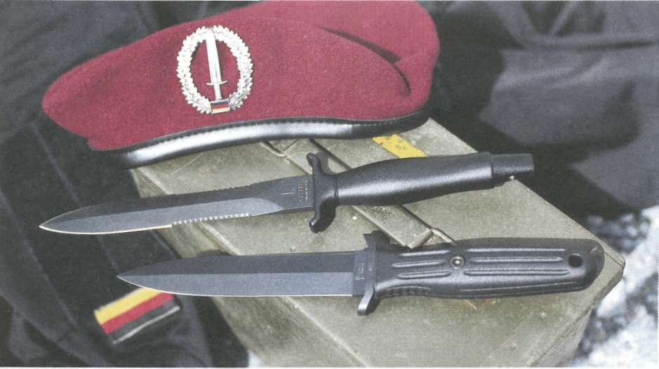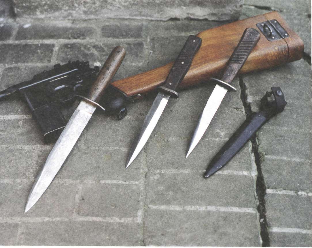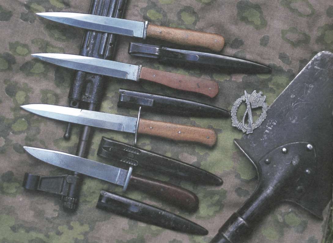 Два немецких и один австрийский (слева) траншейные ножи времен Первой мировой войны. Наиболее известные немецкие боевые ножи Второй мировой (сверху вниз): две модели пехотных ножей 42 — нож «Люфтваффе» и нож «Пума» для ближнего боя с характерной рукояткой из бакелита красного цвета. Третья, современная конструкция кинжала десантных войск «Фэрбэрн-Сайкс», изготовленного фирмой «Уилкинсон Суорд».