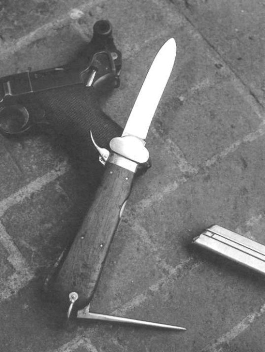 Нож фирмы «Пума» для ближнего боя является одним из наиболее известных представителей этого типа ножей. Новым в этой модели был прочный пластик бакелит, из которого была изготовлена рукоятка. Хотя этот нож был пригоден в первую очередь как оружие, его слегка изогнутый клинок, заточенный с одной стороны, прекрасно можно было использовать как обычный или полевой нож. В 1942 году Вермахт принял на вооружение пехотный нож 42. Изготовленный методом штамповки, этот прямой нож целевого назначения был лишен крестовины. Для обкладки рукоятки фирмы-изготовители вновь стали использовать дерево. Люфтваффе также снабжало свои полевые дивизии и парашютные войска (в то время они входили в состав Люфтваффе) так называемым боевым ножом Люфтваффе, напоминавшим своей конструкцией траншейный нож времен Первой мировой войны и имевшим клинок, заточенный с обеих сторон. Самым примечательным с технической точки зрения немецким ножом, не говоря о том, что он был наиболее пригоден во время боевых операций, был принятый на вооружение распоряжением от 24 мая 1937 года складной нож летчиков, который выдавался как летному составу, так и парашютистам. В отличие от более поздних боевых ножей для ближнего боя этот нож в первую очередь использовался как инструмент. Первоначальные смысл и цель его конструкции заключались в том, чтобы экипажи самолетов имели компактный нож, который должен был находиться в кабине самолета, но, прежде всего, мог прикрепляться к парашюту и открываться одной рукой. Преимущество этого ножа проявилось, в частности, в тех случаях, когда парашют зависал на деревьях или других препятствиях, а парашютист держался одной рукой за ветви, а другой быстрыми движениями ножа освобождал себя от строп и ремней. Для этого ему необходимо было лишь нажать на запорный рычаг, после чего лезвие ножа под собственной тяжестью выходило из рукоятки и застопоривалось. Англичанам так понравился этот нож, что они сразу же заказали фирме «Джорж Иберсон & Ко» его изготовление в слегка измененной форме. В войсках союзников также нашли применение многие новые модели.