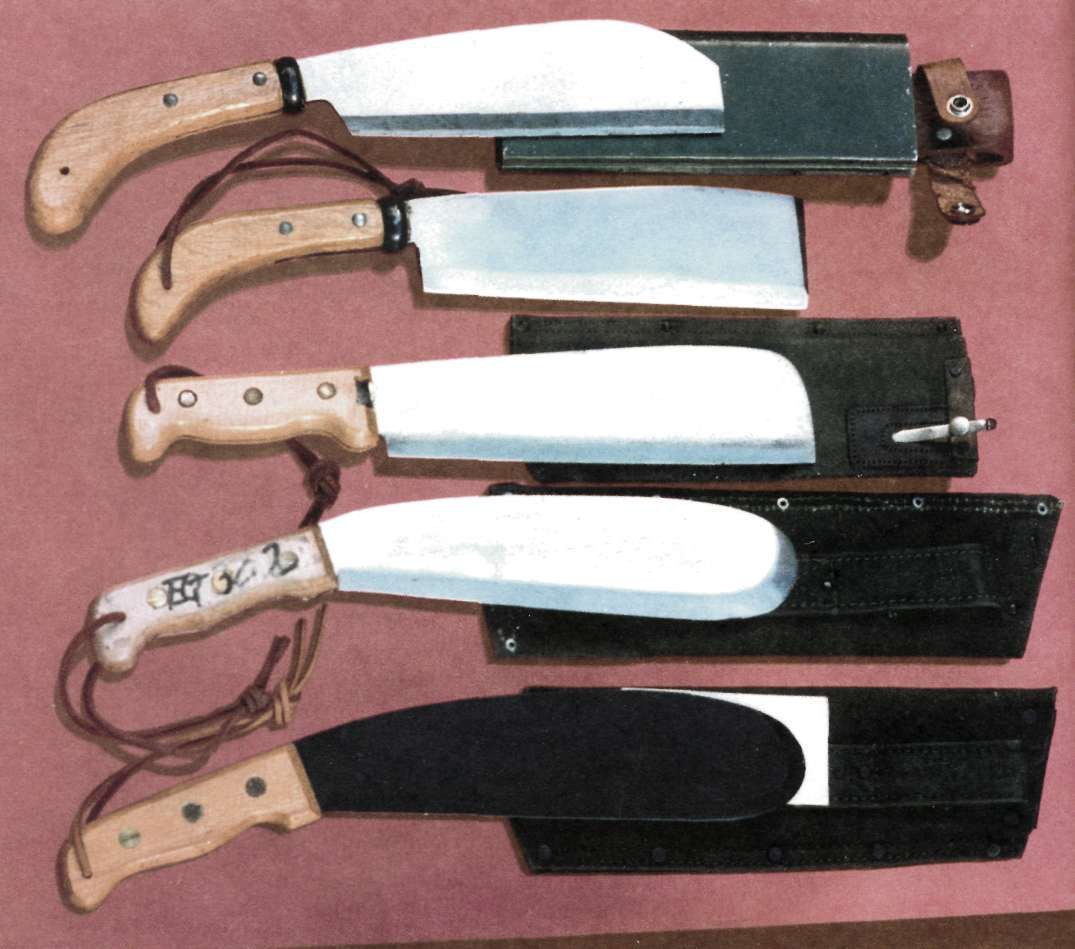 Ножи, изготовленные по эскизам Бэйкера: мачете для групп MACV/SOG. Внизу две модификации «Банановых мачете». Модель 15 «Эйрмен» (Airmen) фирмы «Рэндл». Меньшая по модификации модель боевого ножа, сконструированная для подразделений морской пехоты. Любимый нож десантных спецподразделений: «Марк II» фирмы «Гербер», выполненный из вороненой стали, и особая модификация ножа «A-F» Блэк фирмы «Бейкер» с PVD-покрытием, разработка Р. Эплгейт.