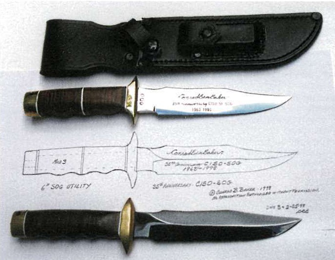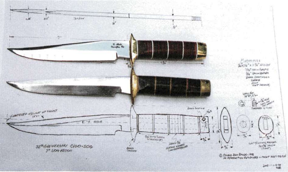 Некоторые ножи, которые сегодня можно найти в коллекциях военных ножей, имеют клинки с лиловым оттенком вместо черного. Нельзя сказать, что этот сакральный цвет создавался специально. Он возник в результате определенного процесса воронения, что, к сожалению, отрицательно сказывалось на твердости клинка. Ножны изготавливались из коричневой, а позднее из черной кожи. Застежка ножен располагалась таким образом, что ее можно было отстегнуть одной рукой, а при вынимании ножа из ножен она не могла быть повреждена клинком. На передней стороне ножен был пришит небольшой кармашек, закрепленный заклепками, где находились два точильных бруска с различной степенью зернистости. Разрешение на использование разработанного проекта и ножей, прошедших испытание, было дано 5-му спецподразделению SOG. 6 июня 1964 года Бэйкер передал рисунки проектов ножей различным японским фирмам-изготовителям холодного оружия для изготовления соответствующих прототипов. Но вскоре CISO ликвидировало заказ, отданный японской фирме «Джапан Сворд» (Japan Sword), из-за низкого качества стали, из которой производились ножи. Выбор пал на сплав марки SKS-3 — хромо-молибденовую сталь, которая после двойной закалки имела твердость 55-57 единиц по шкале Рокуэлла.