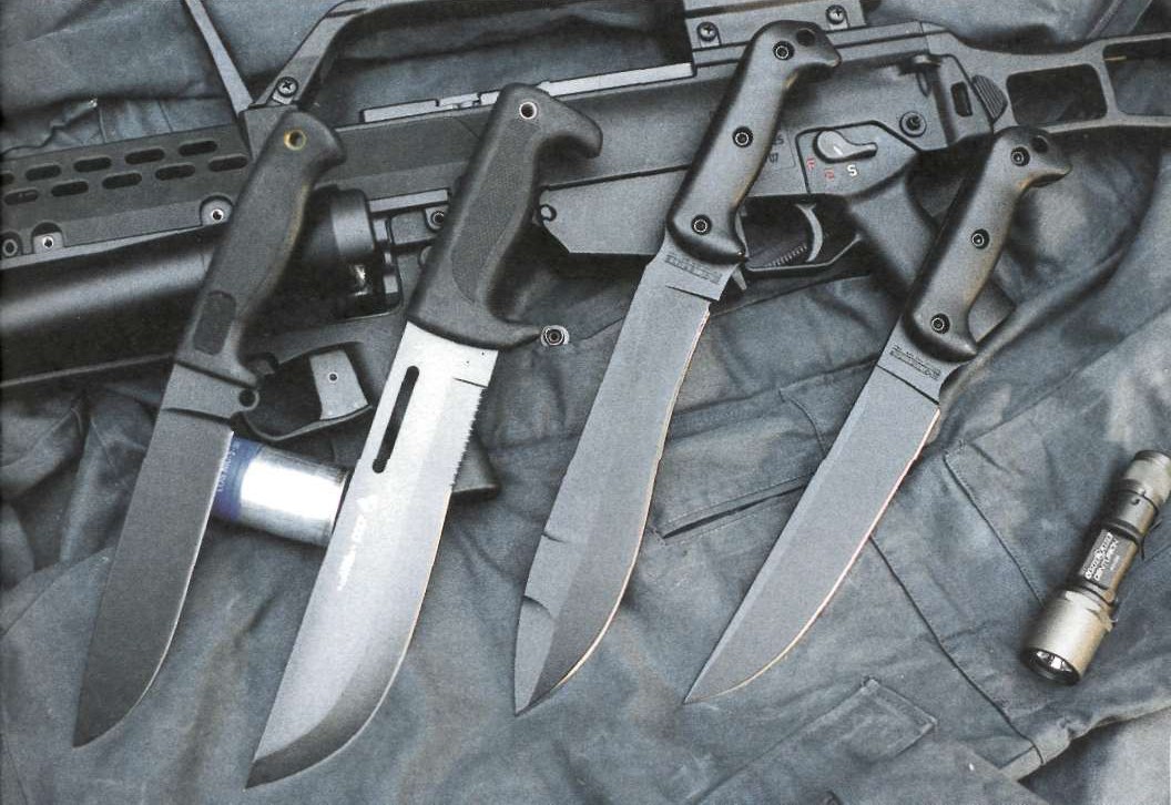 Современные ножи «Кукри» фирм «Бекер Найф & Ту л» (Machax) и «Колд Стил» (Mini Gurkha Light Kurki и Gurkha Kurki). Слева направо: большие, мощные полевые ножи черного цвета фирм «Буссе Найфс» («Комбат бэйсик 7» — Combat Basic 7), «Кольт» (Colt) («Джангл коммандер» — Jungle Commander) и «Бекер Найф &Тул» («Брут» и «Магнум кэмп» — Brut и Magnum Camp). Нож «Тэктул» (Tactool) фирмы «Бейкер Найф & Тул» выделяется среди тактических боевых ножей своей необычной формой клинка.