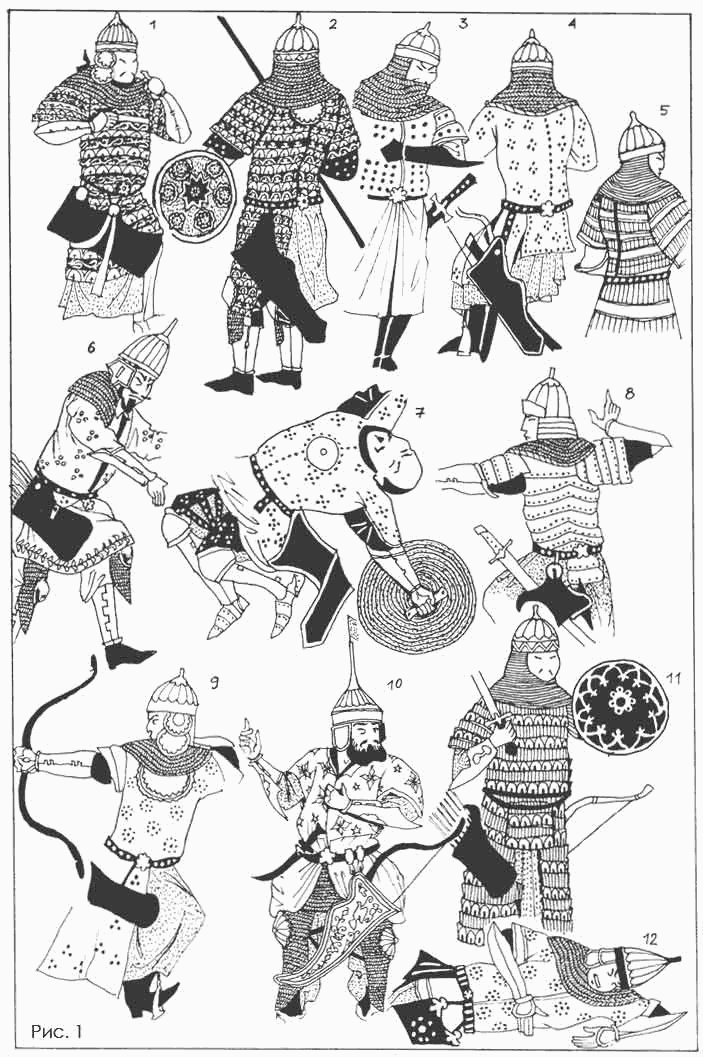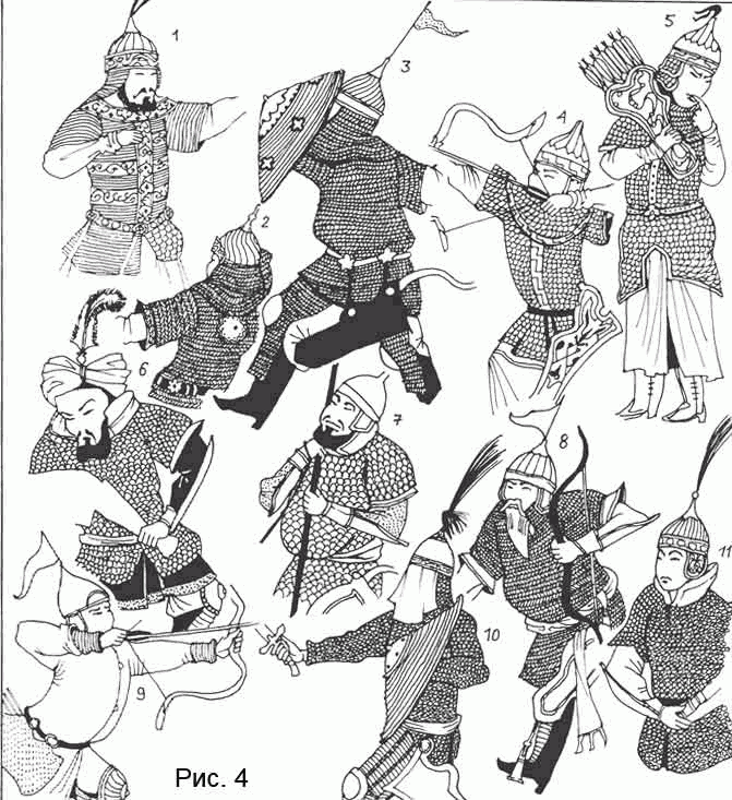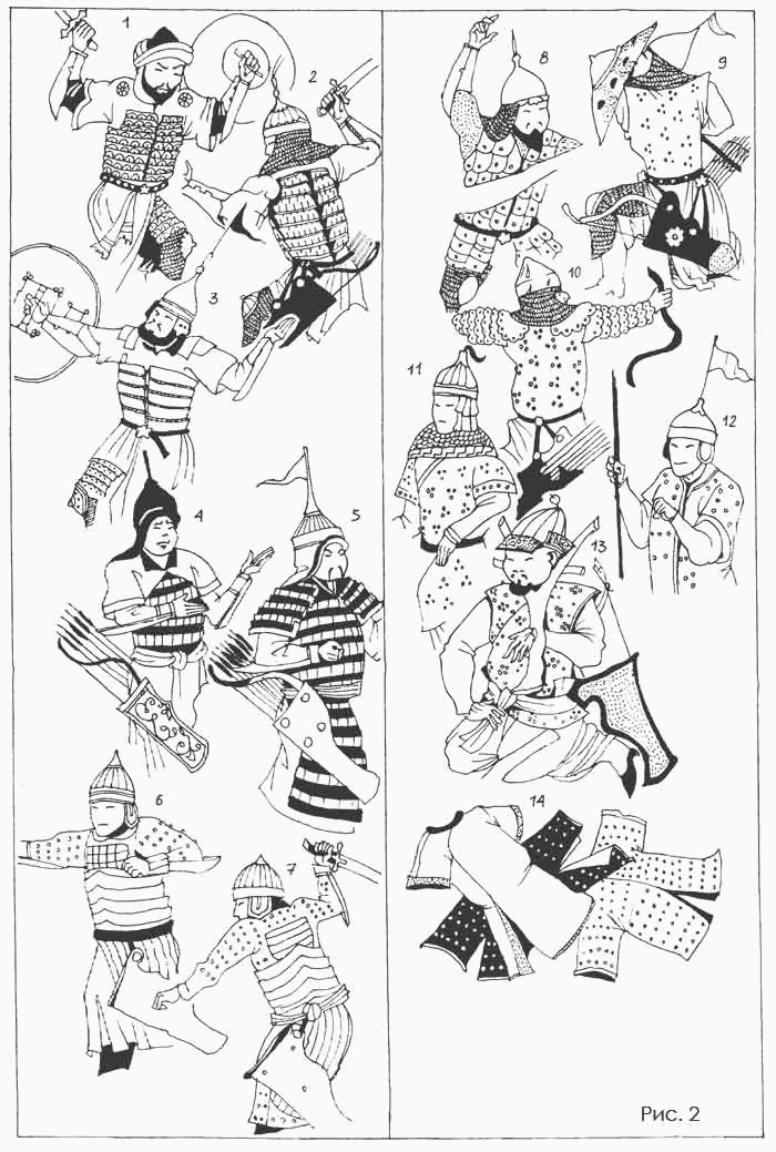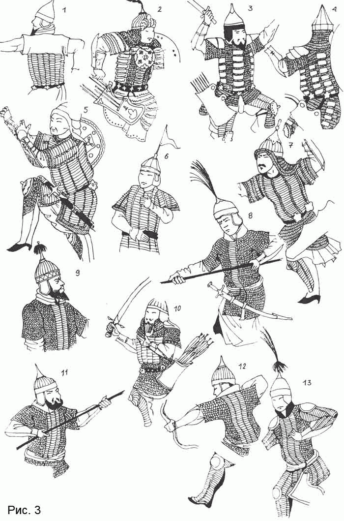 О наличии кольчатых доспехов под халатом с очень большой долей вероятности можно говорить у тех воинов, кто обладает защищенным панцирем конем или сам имеет защиту ног и бедер. Это видно, в тех случаях, когда полы халата короткие или они заткнуты за пояс (табл. 10: 8, 12). Но на миниатюрах очень многие воины имеют шлемы и наручи, но не обладают остальными признаками тяжеловооруженного воина. При этом они разительно отличаются от изображенных там же пехотинцев и легковооруженных всадников. С несколько большей осторожностью можно предположить, что и они скрывают кольчугу под верхней одеждой.