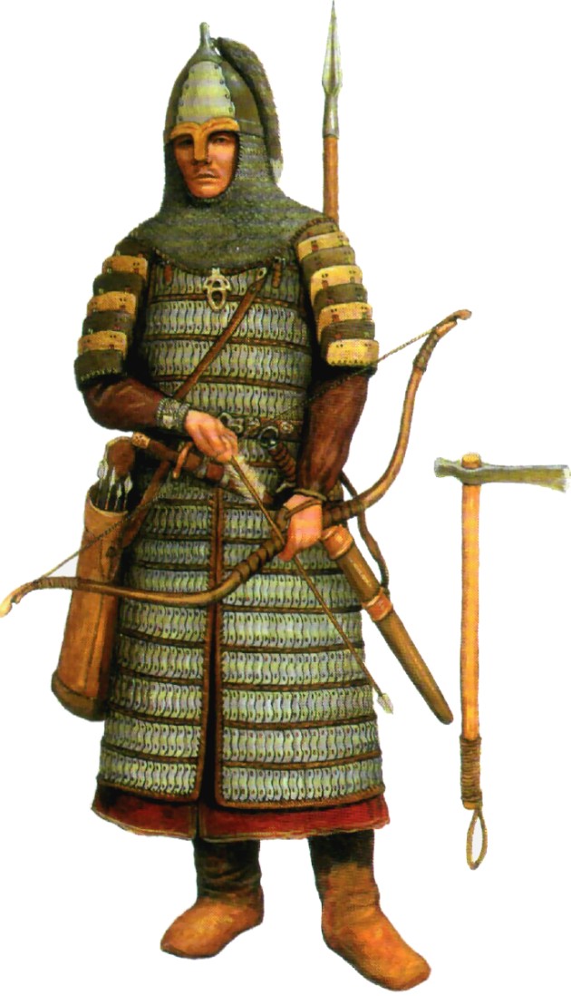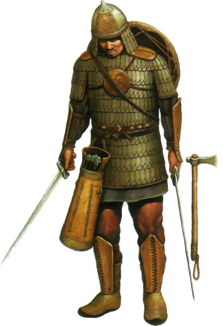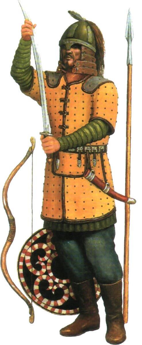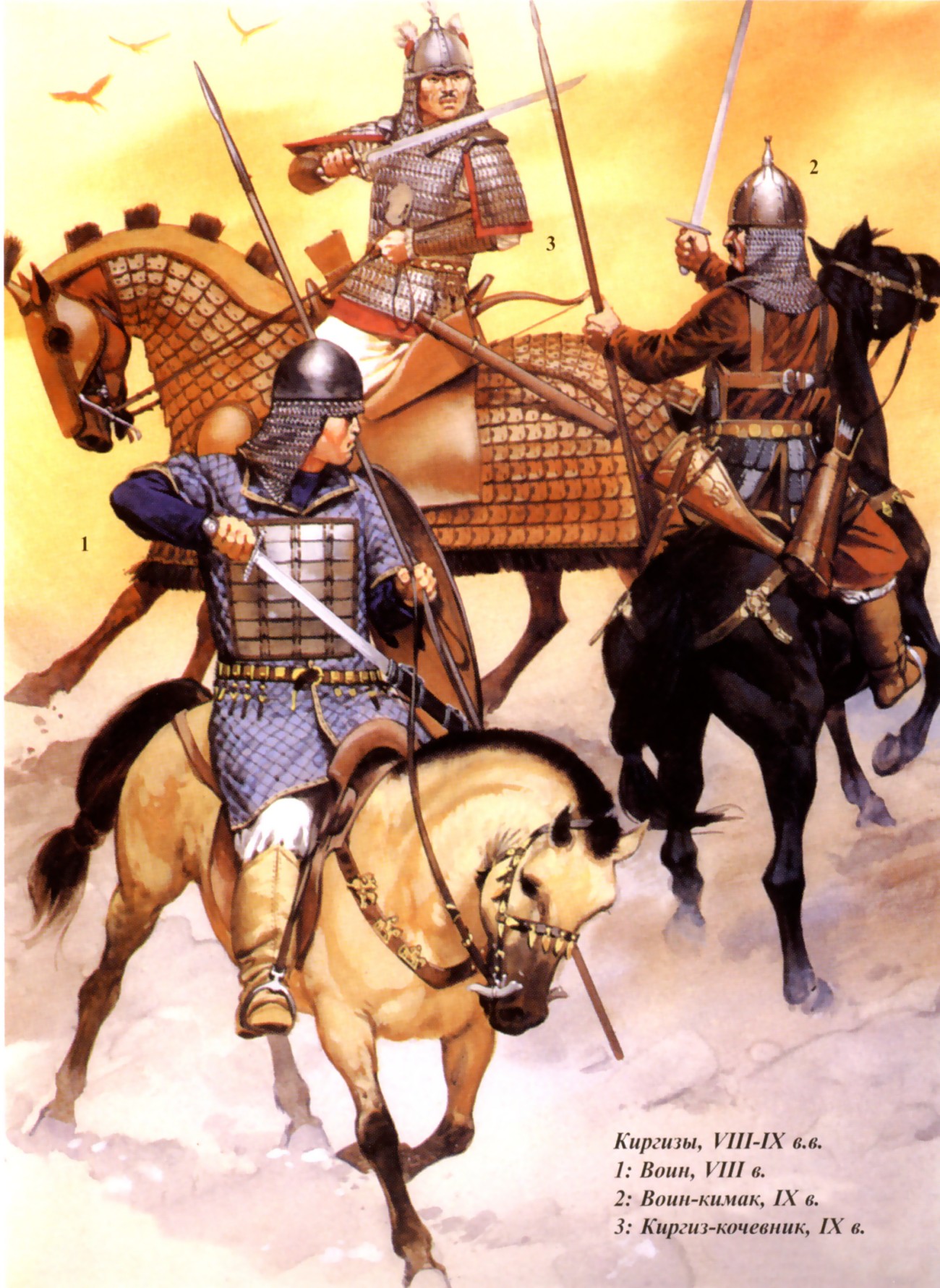 Кыргызский тяжеловооруженный воин эпохи Великодержавия. Его защитное вооружение состоит из крупнопластинчатого клепаного шлема (а) с бармицей (б), изготовленной из металлических пластин и снабженной мягкой подкладкой: короткополого панциря (в), сплетенного шнурами из железных пластин; накладных деревянных щитков (?) на плечах и груди; также деревянных поножей (д) и наручей (е); щита (ж), собранного из обтянутых кожей дощечек. При атаке в конном строю или стрельбе из лука щит забрасывался за спину, где удерживался с помошью специального ремня (з). На воине – два пояса. К «стрелковому» поясу кренится берестяной колчан (и) открытою типа, украшенный накладными костяными пластинками (к). В руках у воина две сабли – с брусковидным (л) и ромбовидным (м) перекрестиями. Дополняет вооружение ближнего боя узколезвийный топор (и) со шпеньком на обухе. Реконструкция по материалам Ю. С. Худякова