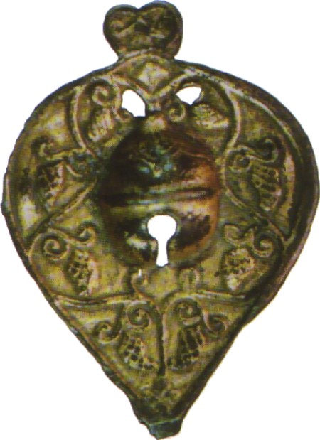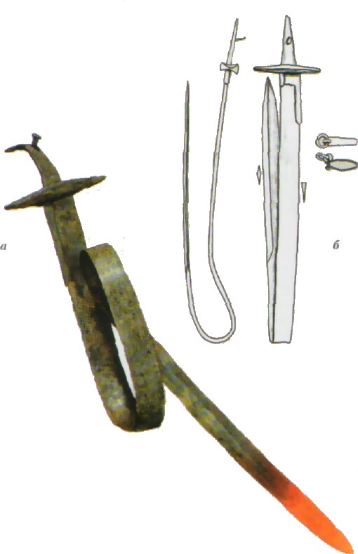 Некоторые мечи еще снабжались прямым перекрестием и коплевидным навершием. Правда, если в гунносарматское время кольца навершия делали из отдельного железного прута, а затем приваривали к рукояти, то в средневековье прут, из которого формировали кольцо, сам являлся продолжением плоского рукояточного стержня.