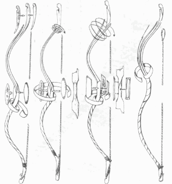 В походах тетива на луках спускалась. Воины носили их на боку или на спине в налучьях, похожих на узкую и длинную (почти но всю длину оружия) трубу, зашитую с одной стороны. Размеры луков со спущенной тетивой колебались от 120 до 140 сантиметров.