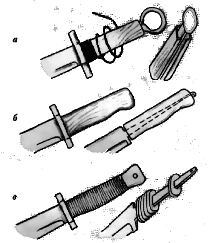 Но, в большинстве своем, мечи делали без перекрестия и навершия. В нижней части рукояточного стержня у них сверлилось отверстие для штифта, которым крепились боковые обкладки рукояти. Вероятно, навершие в этом случае вырезалось заодно с ними. У основания лезвия обе половинки рукояти стягивались металлической скобой – она и выполняла функцию съемного перекрестия.