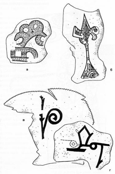 И наконец, еще один вид одежды зафиксирован в катакомбах Змейского могильника. В 9-й катакомбе в области живота и под поясницею одного из костяков были найдены два больших куска кожи Одинаковые по форме и размерам, они имели овальный нижний край и множество дырочек вдоль прямого верхнего края, в которых кое-где сохранились обрывки пропущенной сквозь них кожаной нити или узкого кожаного ремешка. Такие же фрагменты кожи, обшитой бубенчиками, встретились и в других катакомбах. Возможно, эта особая набедренная деталь костюма, которая была заимствована аланами у половцев.