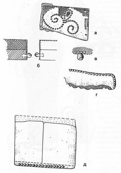Еще одним вариантом декоративной отделки было использование металлического галуна, которым выкладывали орнамент или рисунок В некоторых случаях межузорное пространство заполняли металлическими бусинками. Таким способом украшены кожаная сумочка треугольной формы с изображением фантастического чудовища и фрагмент кожаной попоны, на котором представлены сидящие на дереве и клюющие ягоды павлины с опущенными хвостами. Для заполнения пространства между образующим рисунок сутажом на попоне использованы металлические бусины В этой же технике выполнено изделие, кожаный фрагмент которого найден в могильнике Рим-Гора, но узор в данном случае выполнен шелковым шнуром.