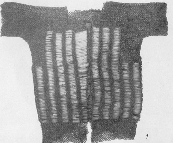 IX-Х вв., представляют пластины, которые связывались между собой ремешками и поэтому не требовали подкладочной основы. Одежда этого рода доходила до колен и использовалась вплоть до конца XV в. Начиная с середины XIII в. стало преобладать другое, более гибкое прикрытие, состоящее из прямоугольных или квадратных пластин, прикреплявшихся к мягкой основе наподобие черепицы. Такая защита по сравнению с пластинчатой имела большую эластичность, так как чешуйки, притороченные к материи или коже только с одной стороны и в центре, давали возможность некоторого движения.