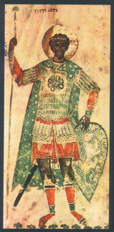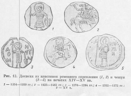 Описанные выше системы наборной брони лучше, чем где-либо, и с протокольной тщательностью представлены па клейме житийной иконы "Св. Георгий" начала XIV в. и особенно на симоновско-хлудовских миниатюрах. При этом 11-12 раз показаны пластинчатые доспехи, 21-22 раза - чешуйчатые. Преобладание последних подтверждают несколько более поздние рисунки хроники Георгия Амартола и археологические находки.