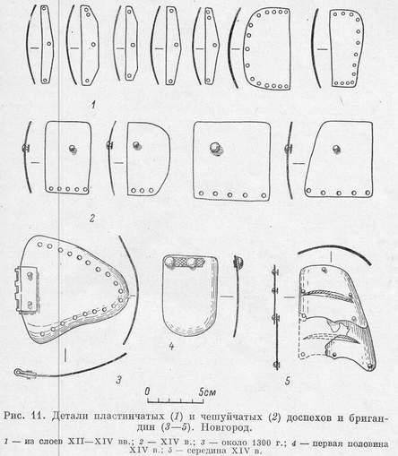 Доспех XIV-XV ив., до последней поры известный лишь по условным изображениям икон и фресок и во многом загадочный, был впервые археологически опознан А. Ф. Медведевым. Больше всего пластин доспеха найдено в Новгороде (из слоев середины XIII-XVI в. извлечено 380 деталей примерно от 20 комплектов). Год от года карта интересующих нас находок расширяется, к 1961 г. в ее составе были, кроме Новгорода, Псков, Торопец, Москва, Тушково, Переяславль-Рязанский, Смоленск, Друцк и ряд других мест.