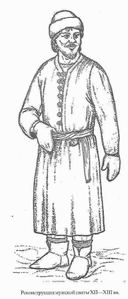 Рубаха и порты составляли основу костюма. Но, выходя на улицу, одевалась еще свита. Одежду дополняли шапка и сапоги. Интересен перечень носильных вещей в расписке, выданной в первой половине XIII в. новгородским ростовщиком неким Гришке и Косте: "А Гришки кожюхе, свита, сороцица, шяпка. А Костина свита, сороцица. А сапоги Костини, а дроугии Гришкини”. Здесь перечислен весь комплекс мужского костюма, за исключением штанов: сорочка, свита, шапка, сапоги, кожух. Из источников того времени известно, что горожане, как и крестьяне, носили на улице также безрукавный плащ — вотолу.