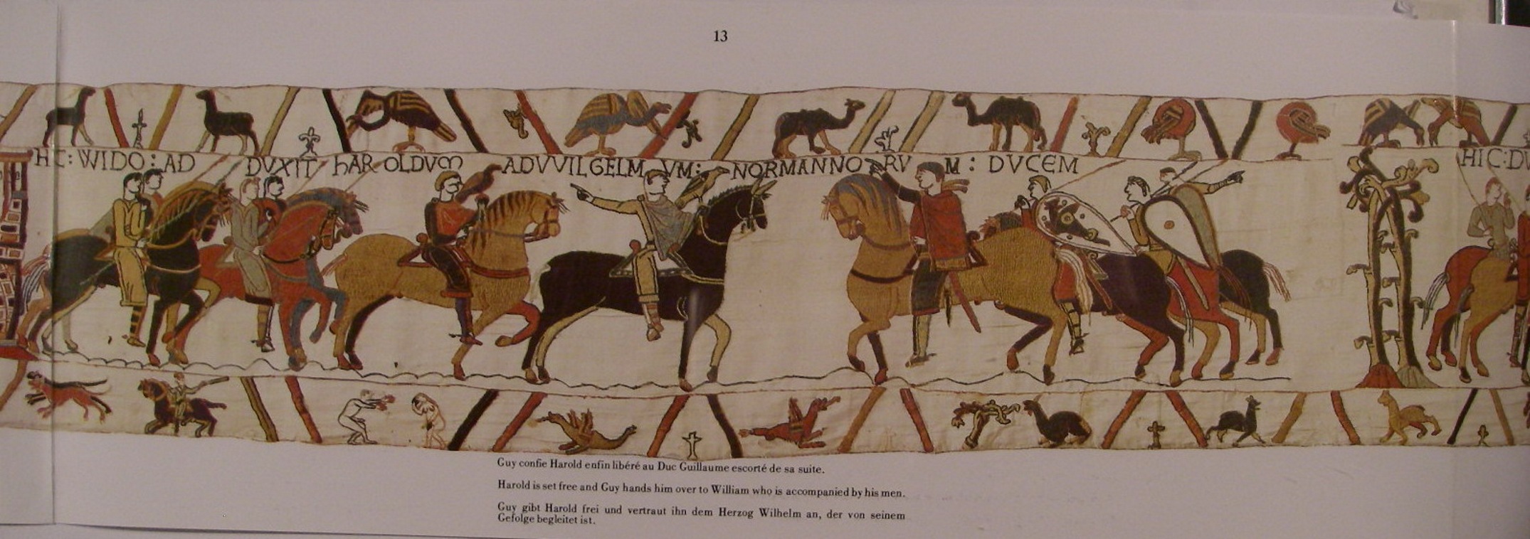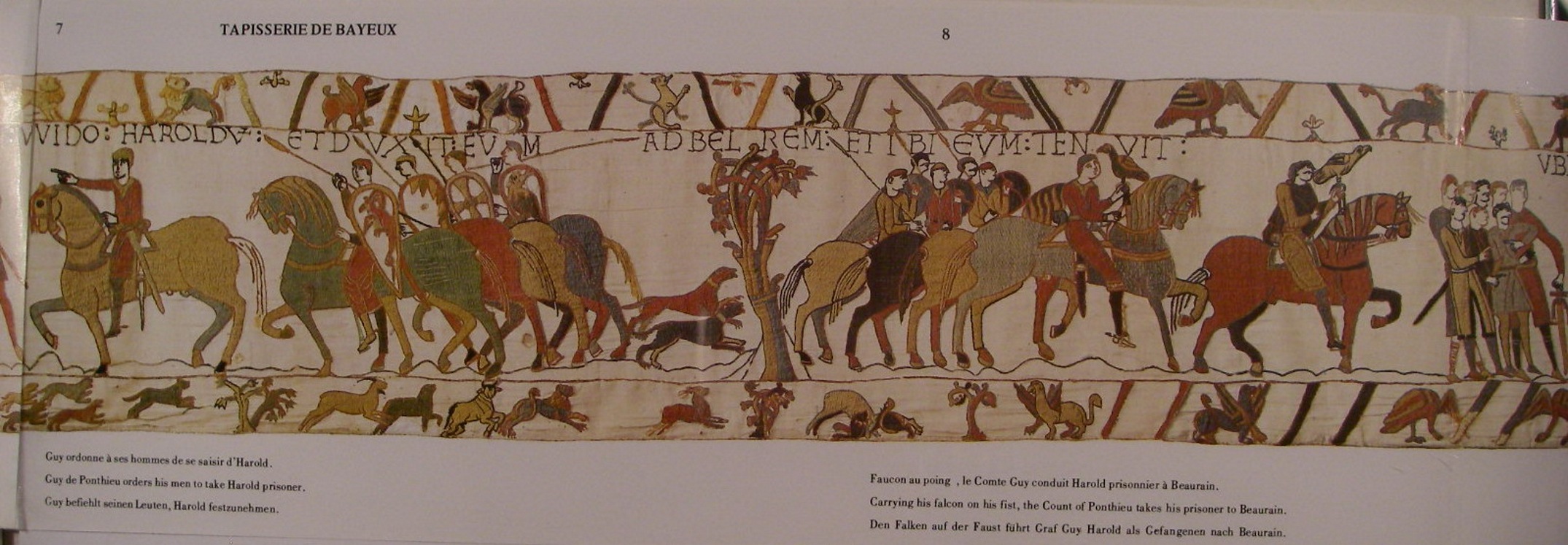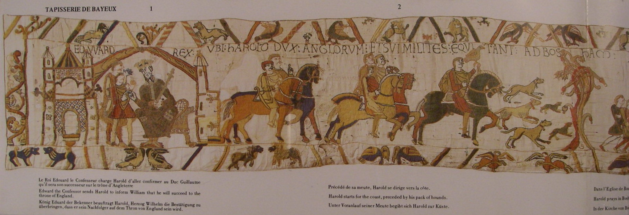 | Гобелен из Байо, полная репродукция | Эдуард Исповедник посылает Гарольда сообщить, что Вильгельм может претендовать на престол Англии. Гарольд со свитой скачет по побережью, перед ним свора собак |