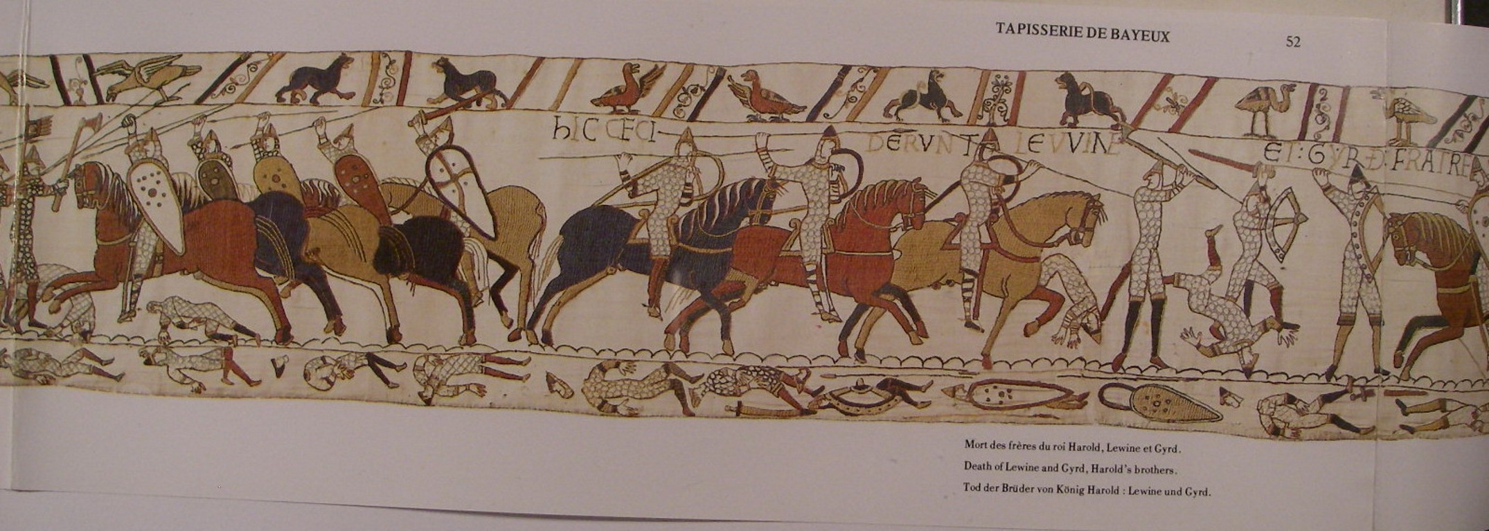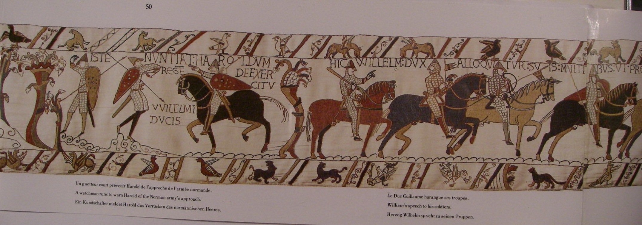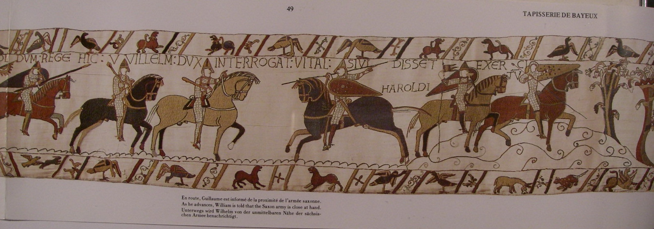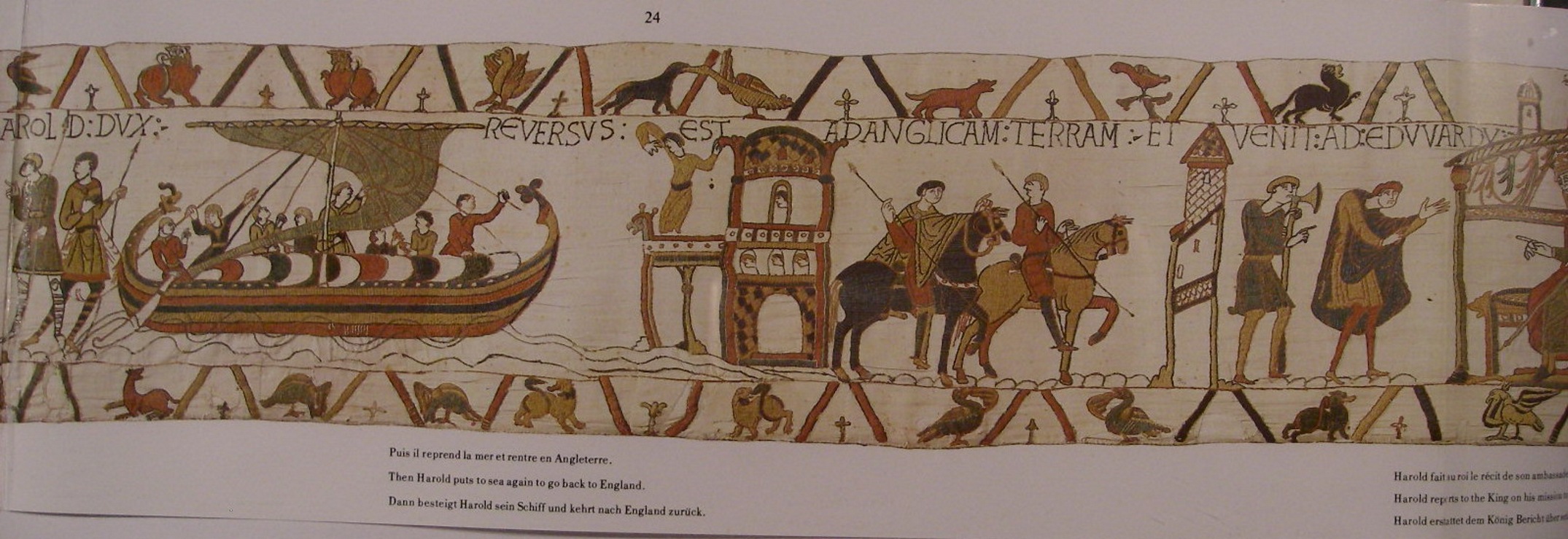 | Гобелен из Байо, полная репродукция | Эдуард Исповедник посылает Гарольда сообщить, что Вильгельм может претендовать на престол Англии. Гарольд со свитой скачет по побережью, перед ним свора собак |