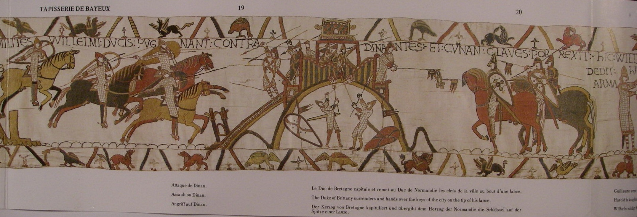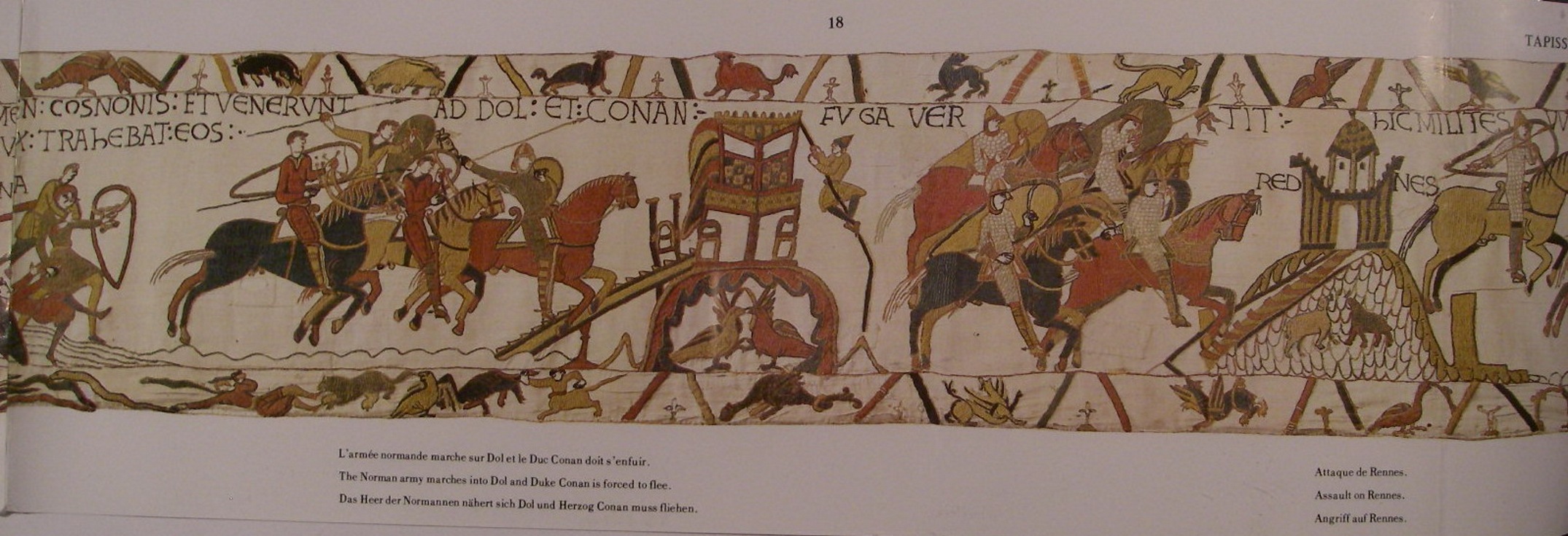 | Норманнская армия марширует по герцогству и герцог Конан вынужден бежать. Нападение на Рен. | Герцог Бретани сдается и передает ключи от города, на кончике копья. |