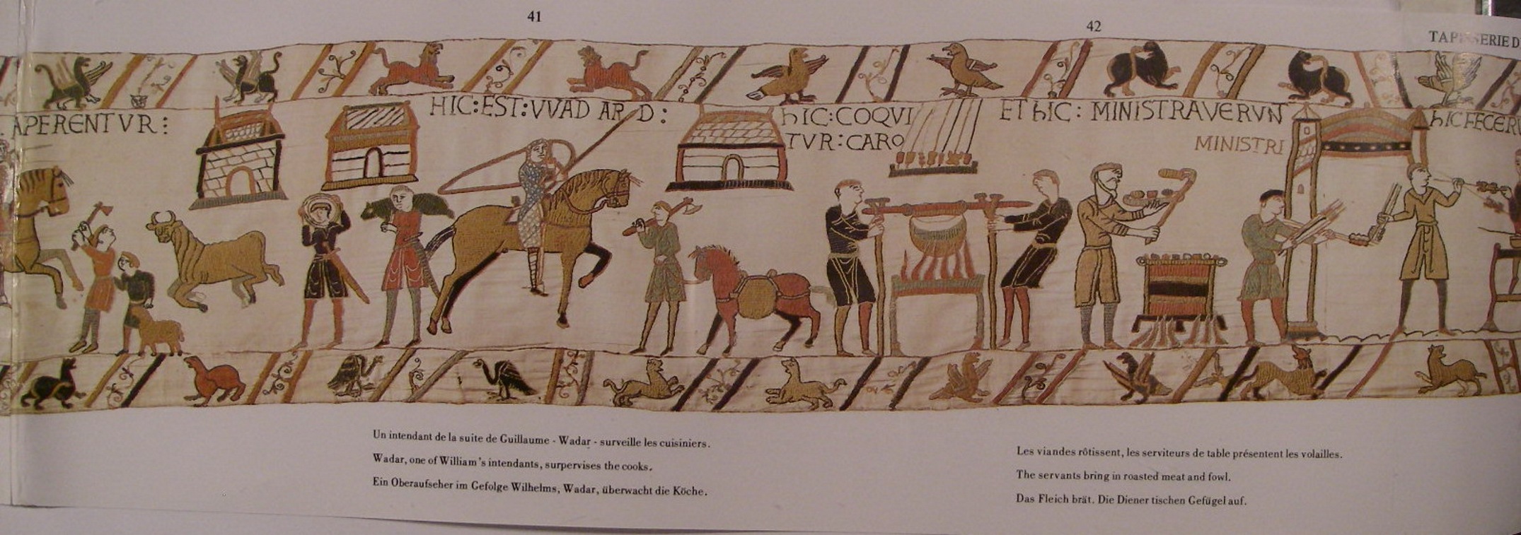 | Мужчины вытаскивают лошадей на берег. Норманнские всадники отправляются в Гастингс. | Вадар, один из интендантов Вильгельма, контролирует поваров. Слуги приносят жареные куски мяса и птицы. |