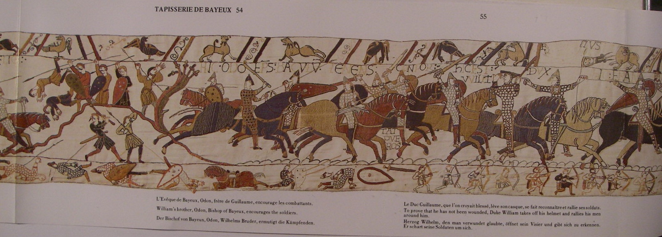 | Разгорелся Бой | Братья Вильгельма и Епископ Одо приободряют солдат. Чтобы доказать, что он не был ранен, герцог Вильгельм снимает шлем и люди ликуют вокруг него. |