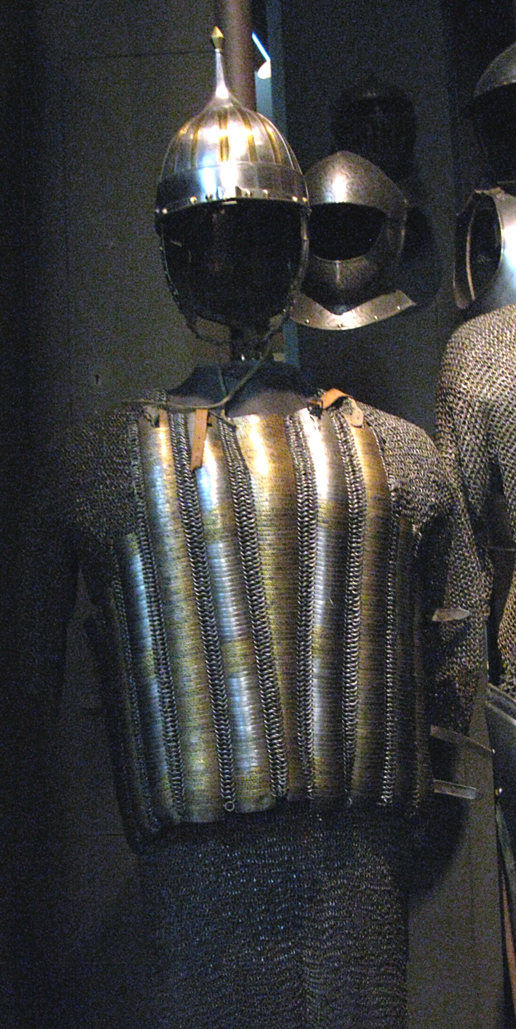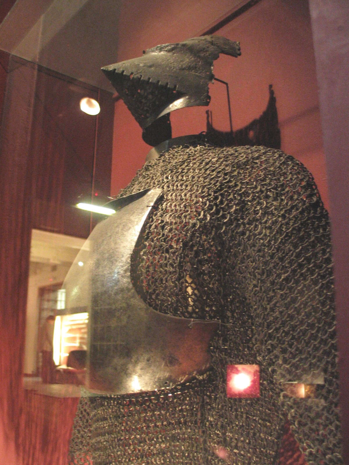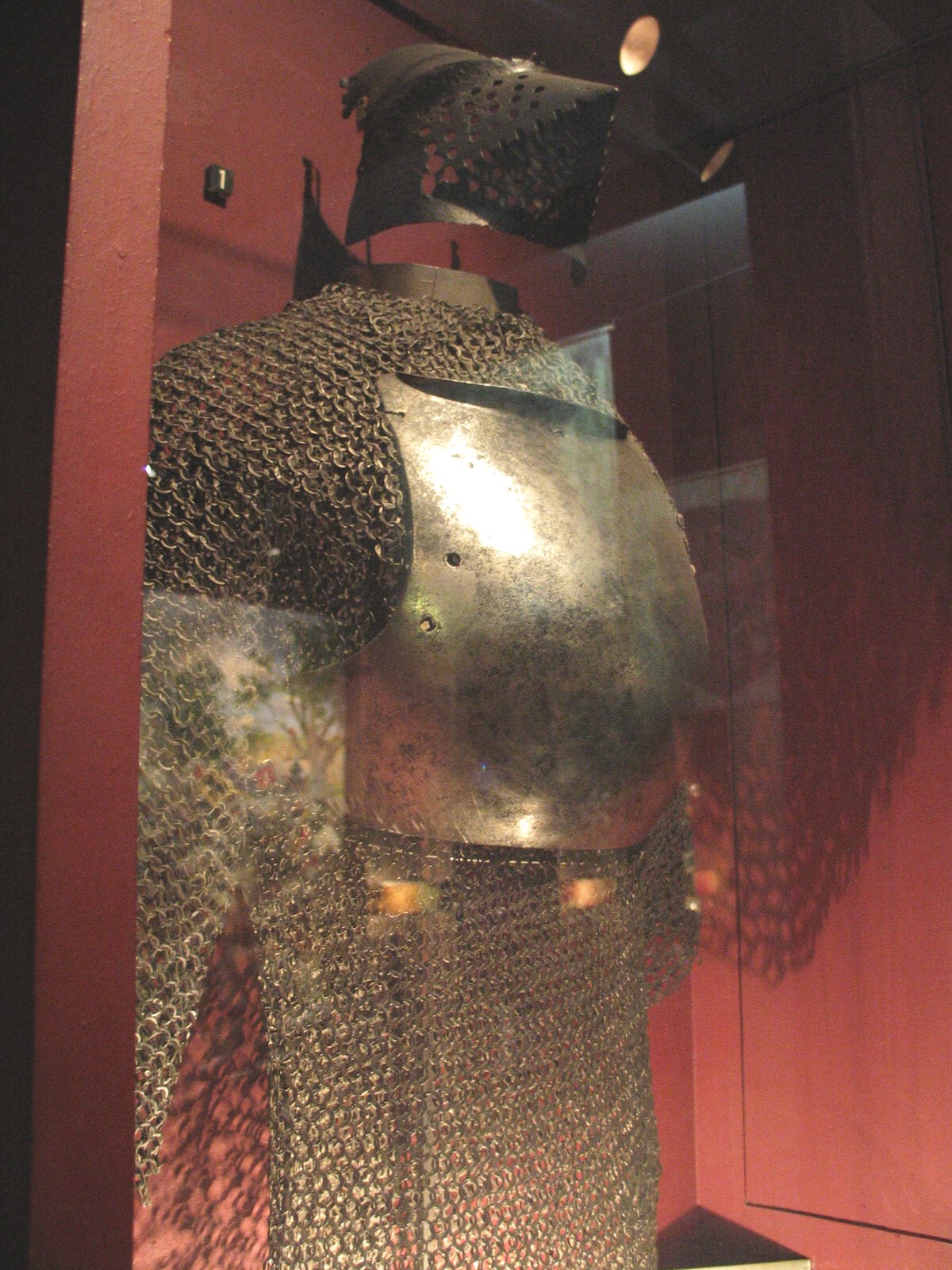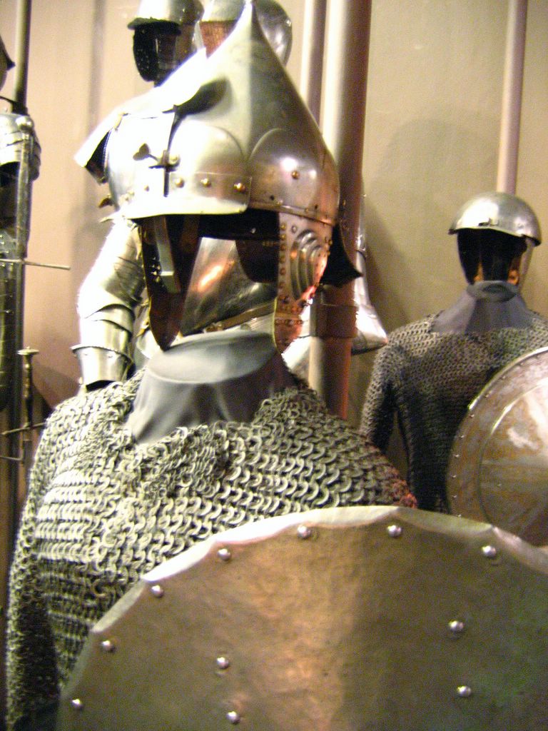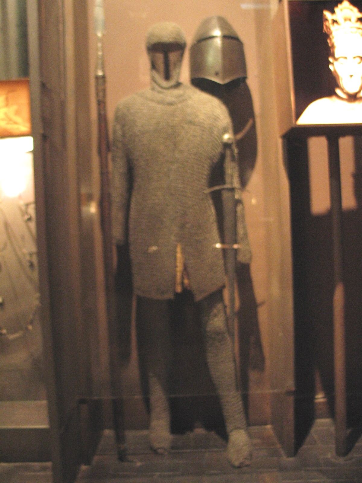 1) С кольчужным доспехом первой половины 14 века идет не оригинальный топфхельм, а реплика.