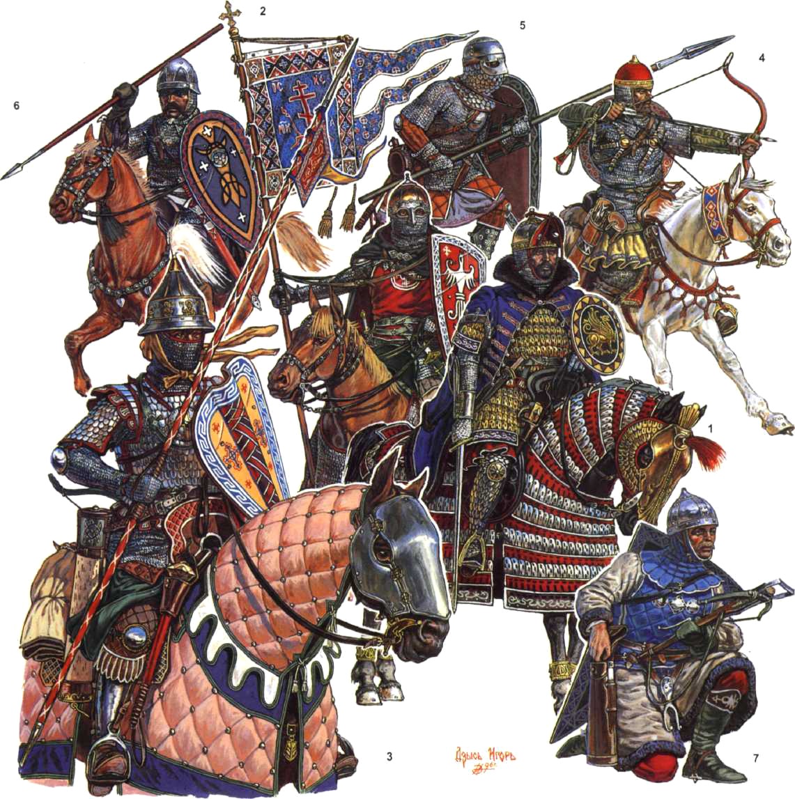 Вторая, колоннообразная часть хоругви, согласно «Приготовлению к походу», состояла из четырехугольного построения, включавшего кнехтов. Число кнехтов в каждом из трех названных выше отрядов равнялось соответственно 365, 442 и 629 (или 645). Они располагались в глубину от 33 до 43 шеренг, в каждой из которых находилось от 11 до 17 конных. Среди кнехтов находились слуги, входившие в состав боевой свиты рыцаря: обычно лучник или арбалетчик и оруженосец. Все вместе они образовывали низшую войсковую единицу — «копье» — численностью 35 человек, редко более. Во время боя эти воины, экипированные не хуже рыцаря, приходили на помощь своему господину, меняли ему коня.13 К достоинствам колонно-клиновидной хоругви относится ее сплоченность, фланговая прикрытость клина, таранная сила первого удара, четкая управляемость. Строй такой хоругви был удобен и для передвижения, и для завязки боя. Плотно сомкнутым шеренгам головной части отряда при соприкосновении с противником не надо было разворачиваться для защиты своих флангов. Клин надвигающегося воинства производил устрашающее впечатление, мог вызвать смятение в рядах противника при первом натиске. Клин-отряд был предназначен для разрыва строя противостоящей стороны и скорой победы.