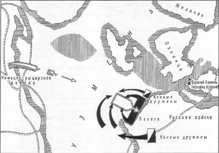 Новгородцы осуществили необычный маневр: они отступили на лед Чудского озера «на Узмени у Воронея камени».9 Туда в боевом порядке подошло и Орденское войско. Таким образом, место битвы было предложено русской стороной с явным расчетом осуществить против немецкого построения, названного «свиньей», маневренный бой одновременно несколькими отрядами. Боевой порядок русских не описан в источниках, однако, по косвенным данным, поддается истолкованию. В центре находился княжеский полк главнокомандующего, рядом стояли полки правой и левой руки. Впереди главного полка, по свидетельству «Рифмованной хроники», находились стрелки-лучники. Перед нами типичное для своего времени трехчастное деление основного войска, которое могло быть, однако, и более сложным.