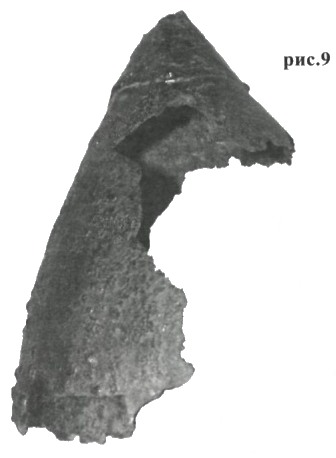 Шлем из с. Демьяновкн бывшего Мелитопольского уезда сохранился в виде целой половины корпуса (правой) с навершием и значительно фрагментированных обломков другой половины.13 На имеющейся части отчетливо прослеживается надглазная выкружка полукруглой формы. Конструктивно корпус монолитен. Утолщение стенок в налобной части не прослеживается. Об этом с полной уверенностью позволяет судить слом в налобной части, который облетает измерение реальной толщины. Таким образом. с большой долей уверенности можно предполагать отсутствие наносника. Полоса венца доходит только до надглазных выкружек. Аналогичное расположение, видимо, имело место и на шлеме из Буртов, однако, современное состояние предмета не позволяет определенно этого утверждать.