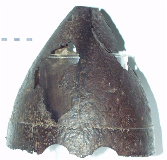 М.В. Горелнк относит шлем "к раннему золотоордынскому периоду". то есть к середине XIII началу XIV вв.14 В целом с датировкой можно согласиться. Происхождение шлема лежит, скорее всего, в XIII столетии, но донашивать подобные наголовья могли, видимо, и позднее. Золотоордынскую принадлежность М.В. Горелик выводит из наличия "круглых мишеней на куполе". На самом деле "мишеней" (полусферических чеканных выступов) на поверхности шлема при натурном обследовании выявлено не было При изучении фотографии исследователь мог принять за мишень крупный участок коррозионной деформации металла (вздутие) Следовательно, монгольская и вообще азиатская принадлежность шлема становится более чем спорным моментом.