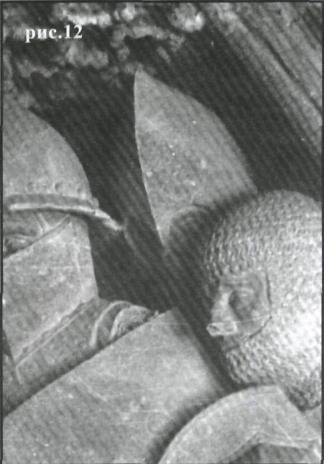 Интересная черта прослеживается при сличении русского вооружения и вооружения европейских стран, существовавших в схожих с Русью условиях. Например. Испания классическая страна зона фронтира. где сталкивались западные и восточные (в данном случае арабские) военные традиции. Испания к началу XIV в. восприняла многие предметы снаряжения, однотипные русским образцам. Сюда можно отнести и шлемы с редуцированным наносником, как, например. на барельефе из собора в Памплоне 1325 г. (рис. 12).17