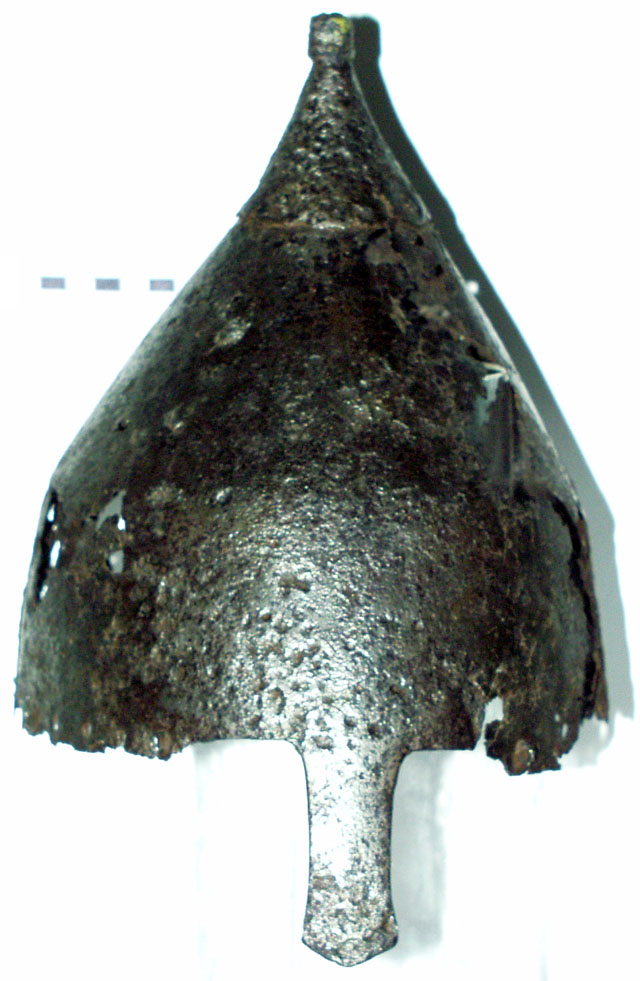 Следующий шлем происходят с территории Восточной Пруссии и датируются периодом XIV-XV вв. Имеется ввиду шлем из под г. Черняховска. Катииинградской обл.20 Корпус имеет монолитную конструкцию. Навершие оформлено в виде шпиля, помешенного внутрь тульи и зафиксированного посредством расклепывания. Поверхность шлема проработана горизонтальными гранями. наведенными способом чеканки.